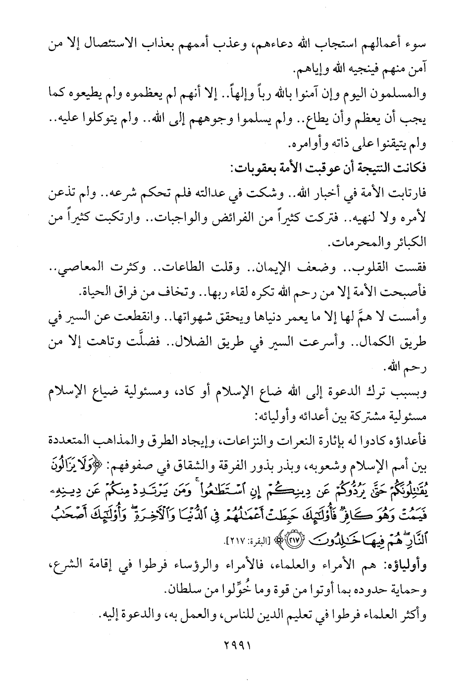 فارتابت الأمة في أخبار الله .. وشكت في عدالته فلم تحكم شرعه .. ولم تذعن لأمره ولا لنهيه .. فتركت كثيراً من الفرائض والواجبات .. وارتكبت كثيراً من الكبائر والمحرمات.