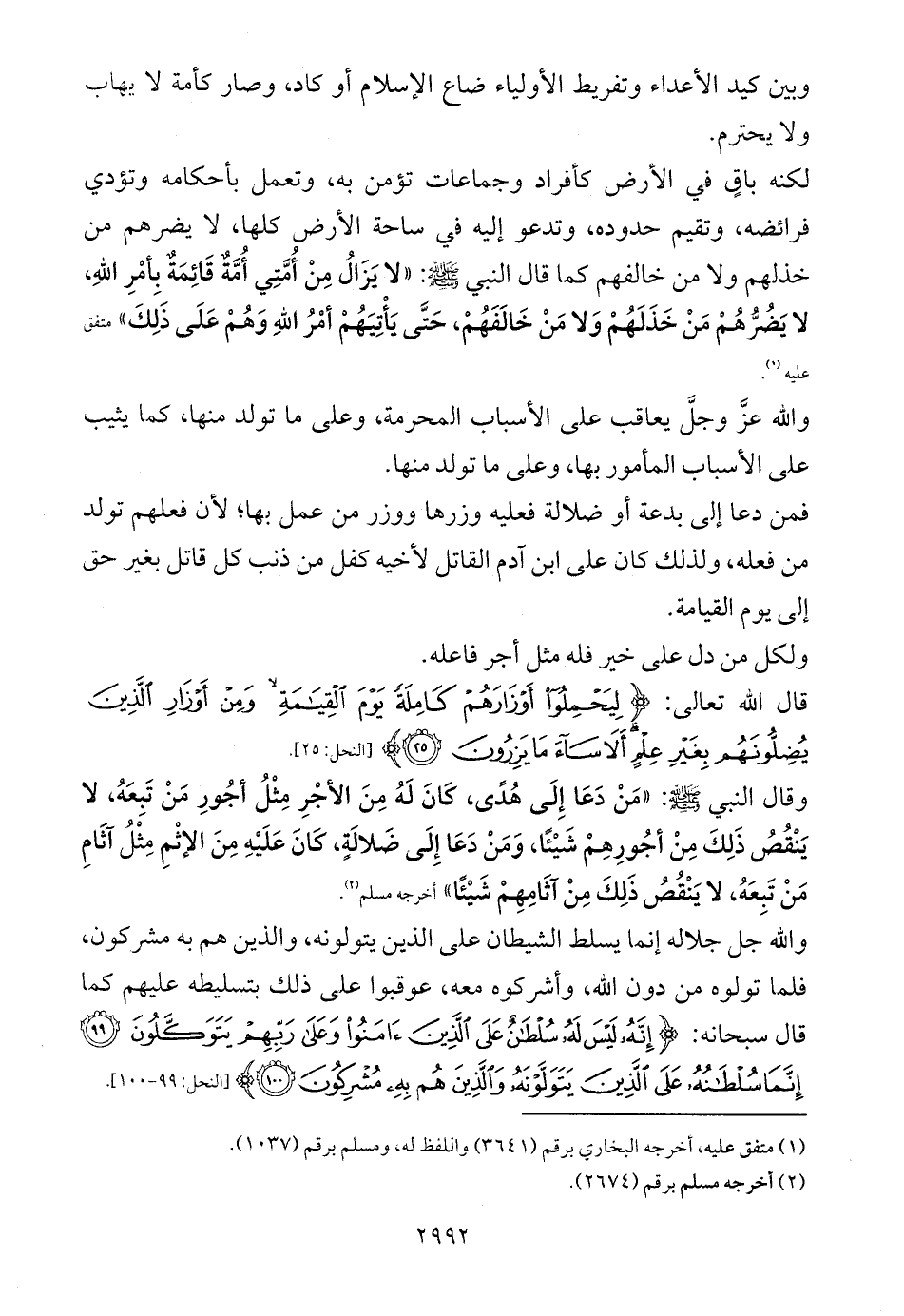وقال النبي - صلى الله عليه وسلم -: «مَنْ دَعَا إِلَى هُدًى، كَانَ لَهُ مِنَ الأجْرِ مِثْلُ أجُورِ مَنْ تَبِعَهُ، لا يَنْقُصُ ذَلِكَ مِنْ أجُورِهِمْ شَيْئًا، وَمَنْ دَعَا إِلَى ضَلالَةٍ، كَانَ عَلَيْهِ مِنَ الإثْمِ مِثْلُ آثَامِ مَنْ تَبِعَهُ، لا يَنْقُصُ ذَلِكَ مِنْ آثَامِهِمْ شَيْئًا» أخرجه مسلم (¬2).