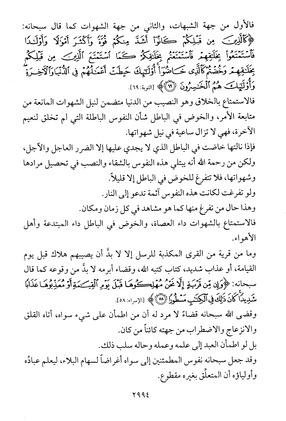 فالأول من جهة الشبهات، والثاني من جهة الشهوات كما قال سبحانه: {كَالَّذِينَ مِنْ قَبْلِكُمْ كَانُوا أَشَدَّ مِنْكُمْ قُوَّةً وَأَكْثَرَ أَمْوَالًا وَأَوْلَادًا فَاسْتَمْتَعُوا بِخَلَاقِهِمْ فَاسْتَمْتَعْتُمْ بِخَلَاقِكُمْ كَمَا اسْتَمْتَعَ الَّذِينَ مِنْ قَبْلِكُمْ بِخَلَاقِهِمْ وَخُضْتُمْ كَالَّذِي خَاضُوا أُولَئِكَ حَبِطَتْ أَعْمَالُهُمْ فِي الدُّنْيَا وَالْآخِرَةِ وَأُولَئِكَ هُمُ الْخَاسِرُونَ (69)} ... [التوبة: 69].