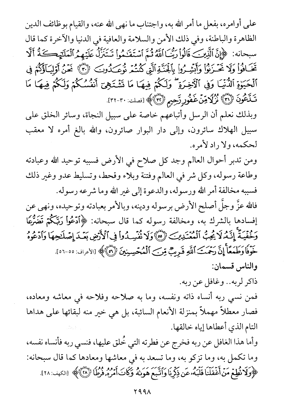 على أوامره، بفعل ما أمر الله به، واجتناب ما نهى الله عنه، والقيام بوظائف الدين الظاهرة والباطنة، وفي ذلك الأمن والسلامة والعافية في الدنيا والآخرة كما قال سبحانه: {إِنَّ الَّذِينَ قَالُوا رَبُّنَا اللَّهُ ثُمَّ اسْتَقَامُوا تَتَنَزَّلُ عَلَيْهِمُ الْمَلَائِكَةُ أَلَّا تَخَافُوا وَلَا تَحْزَنُوا وَأَبْشِرُوا بِالْجَنَّةِ الَّتِي كُنْتُمْ تُوعَدُونَ (30) نَحْنُ أَوْلِيَاؤُكُمْ فِي الْحَيَاةِ الدُّنْيَا وَفِي الْآخِرَةِ وَلَكُمْ فِيهَا مَا تَشْتَهِي أَنْفُسُكُمْ وَلَكُمْ فِيهَا مَا تَدَّعُونَ (31) نُزُلًا مِنْ غَفُورٍ رَحِيمٍ (32)} [فصلت: 30 - 32].