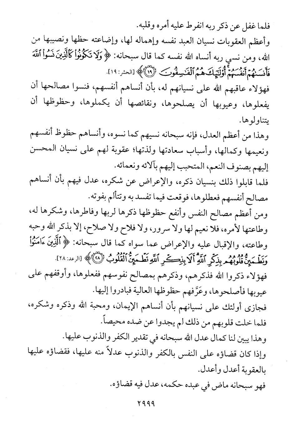 وهذا من أعظم العدل، فإنه سبحانه نسيهم كما نسوه، وأنساهم حظوظ أنفسهم ونعيمها وكمالها، وأسباب سعادتها ولذتها؛ عقوبة لهم على نسيان المحسن إليهم بصنوف النعم، المتحبب إليهم بآلائه ونعمائه.