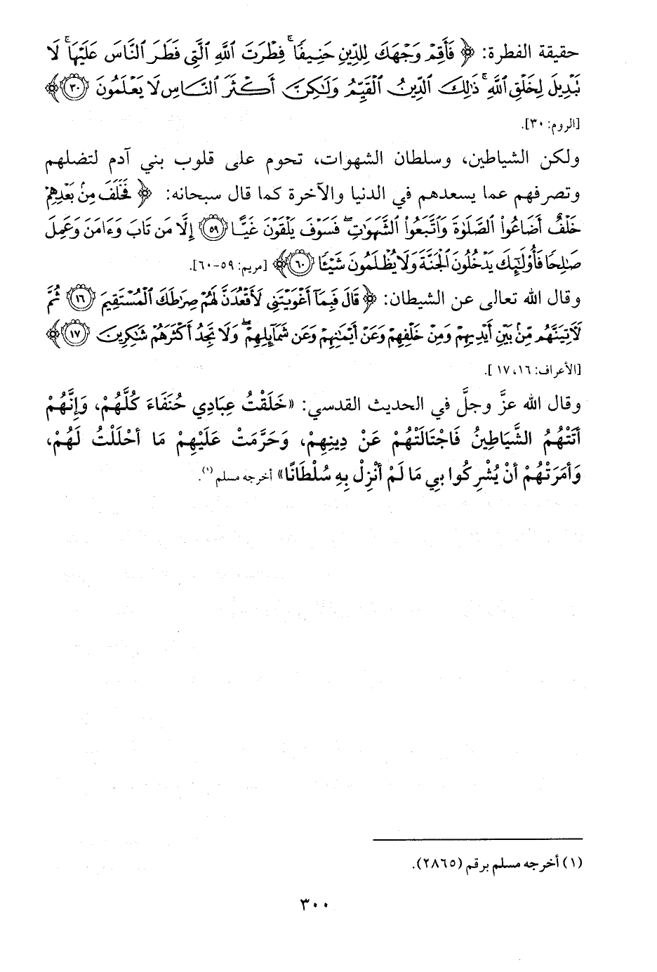 ولكن الشياطين، وسلطان الشهوات، تحوم على قلوب بني آدم لتضلهم وتصرفهم عما يسعدهم في الدنيا والآخرة كما قال سبحانه: {فَخَلَفَ مِنْ بَعْدِهِمْ خَلْفٌ أَضَاعُوا الصَّلَاةَ وَاتَّبَعُوا الشَّهَوَاتِ فَسَوْفَ يَلْقَوْنَ غَيًّا (59) إِلَّا مَنْ تَابَ وَآمَنَ وَعَمِلَ صَالِحًا فَأُولَئِكَ يَدْخُلُونَ الْجَنَّةَ وَلَا يُظْلَمُونَ شَيْئًا (60)} [مريم: 59 - 60].