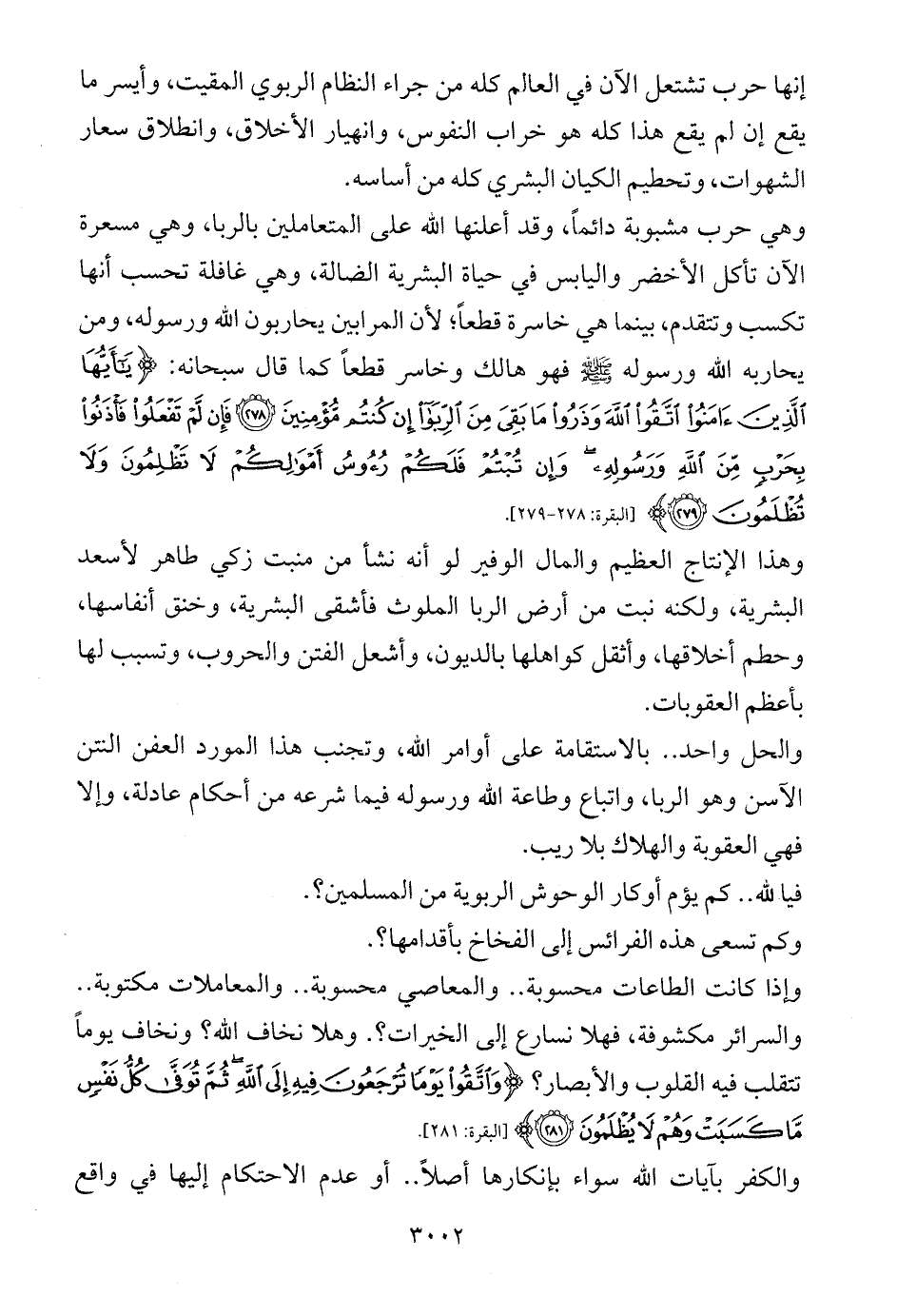 وهي حرب مشبوبة دائماً، وقد أعلنها الله على المتعاملين بالربا، وهي مسعرة الآن تأكل الأخضر واليابس في حياة البشرية الضالة، وهي غافلة تحسب أنها تكسب وتتقدم، بينما هي خاسرة قطعاً؛ لأن المرابين يحاربون الله ورسوله، ومن يحاربه الله ورسوله - صلى الله عليه وسلم - فهو هالك وخاسر قطعاً كما قال سبحانه: {يَاأَيُّهَا الَّذِينَ آمَنُوا اتَّقُوا اللَّهَ وَذَرُوا مَا بَقِيَ مِنَ الرِّبَا إِنْ كُنْتُمْ مُؤْمِنِينَ (278) فَإِنْ لَمْ تَفْعَلُوا فَأْذَنُوا بِحَرْبٍ مِنَ اللَّهِ وَرَسُولِهِ وَإِنْ تُبْتُمْ فَلَكُمْ رُءُوسُ أَمْوَالِكُمْ لَا تَظْلِمُونَ وَلَا تُظْلَمُونَ (279)} ... [البقرة: 278 - 279].