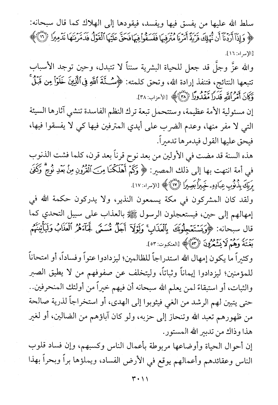 إن مسئولية الأمة عظيمة، وستتحمل تبعة ترك النظم الفاسدة تنشي آثارها السيئة التي لا مفر منها، وعدم الضرب على أيدي المترفين فيها كي لا يفسقوا فيها، فيحق عليها القول فيدمرها تدميراً.
