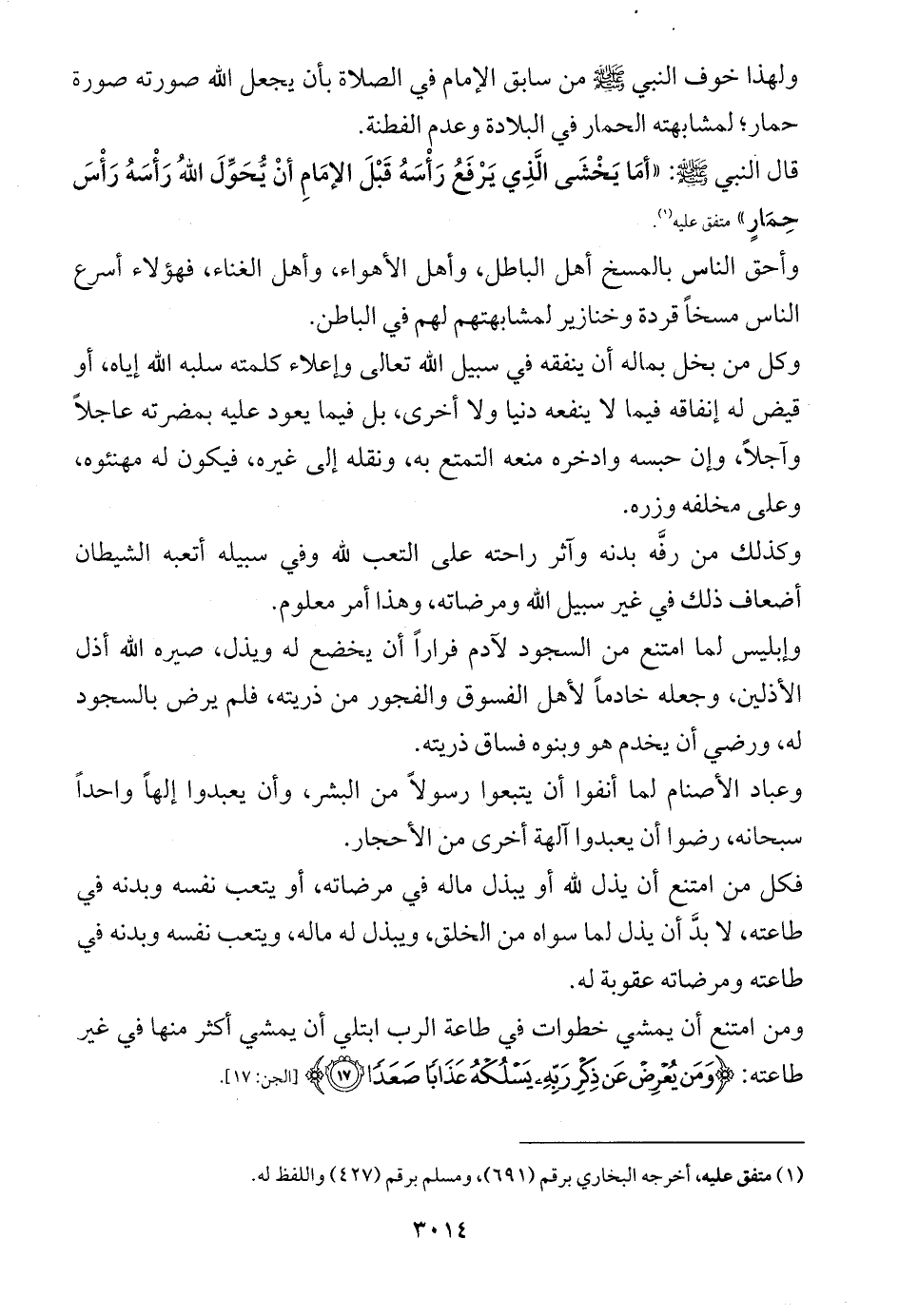 قال النبي - صلى الله عليه وسلم -: «أمَا يَخْشَى الَّذِي يَرْفَعُ رَأْسَهُ قَبْلَ الإمَامِ أنْ يُّحَوِّلَ اللهُ رَأْسَهُ رَأْسَ حِمَارٍ» متفق عليه (¬1).