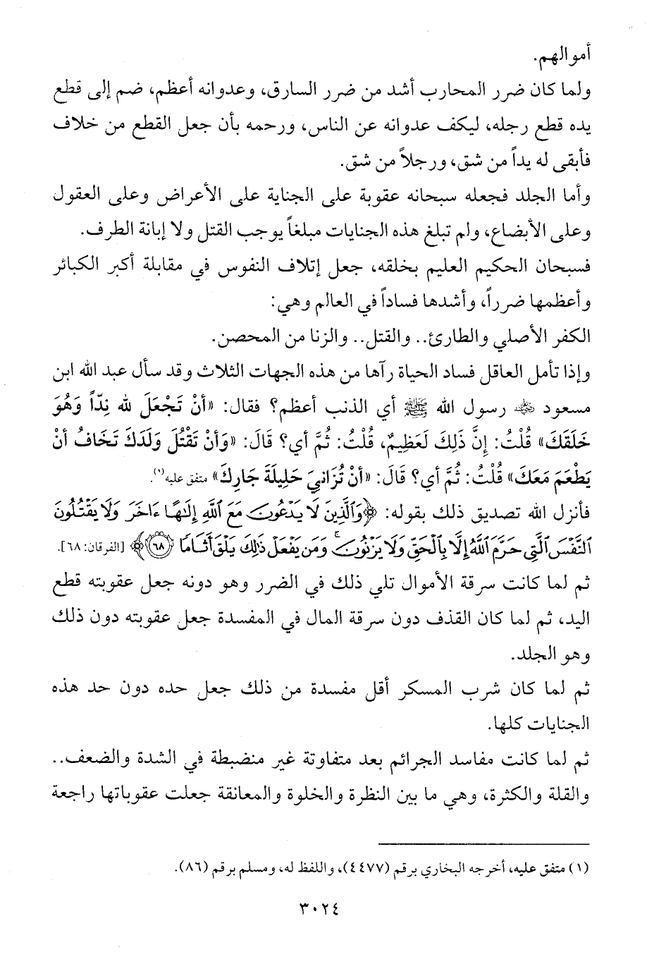 وإذا تأمل العاقل فساد الحياة رآها من هذه الجهات الثلاث وقد سأل عبد الله ابن مسعود - رضي الله عنه - رسول الله - صلى الله عليه وسلم - أي الذنب أعظم؟ فقال: «أنْ تَجْعَلَ لله نِدّاً وَهُوَ خَلَقَكَ» قُلْتُ: إِنَّ ذَلِكَ لَعَظِيمٌ، قُلْتُ: ثُمَّ أيٌّ؟ قَالَ: «وَأنْ تَقْتُلَ وَلَدَكَ تَخَافُ أنْ يَطْعَمَ مَعَكَ» قُلْتُ: ثُمَّ أيٌّ؟ قَالَ: «أنْ تُزَانِيَ حَلِيلَةَ جَارِكَ» متفق عليه (¬1).