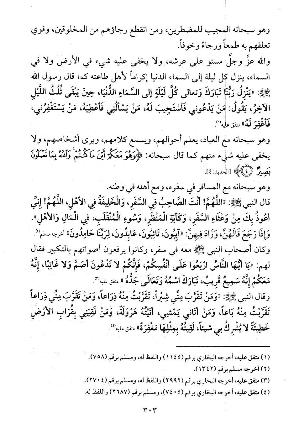 وكان أصحاب النبي - صلى الله عليه وسلم - معه في سفر، وكانوا يرفعون أصواتهم بالتكبير فقال لهم: «يَا أيُّهَا النَّاسُ ارْبَعُوا عَلَى أنْفُسِكُمْ، فَإِنَّكُمْ لا تَدْعُونَ أصَمَّ وَلا غَائِبًا، إِنَّهُ مَعَكُمْ إِنَّهُ سَمِيعٌ قَرِيبٌ، تَبَارَكَ اسْمُهُ وَتَعَالَى جَدُّهُ» متفق عليه (¬3).
