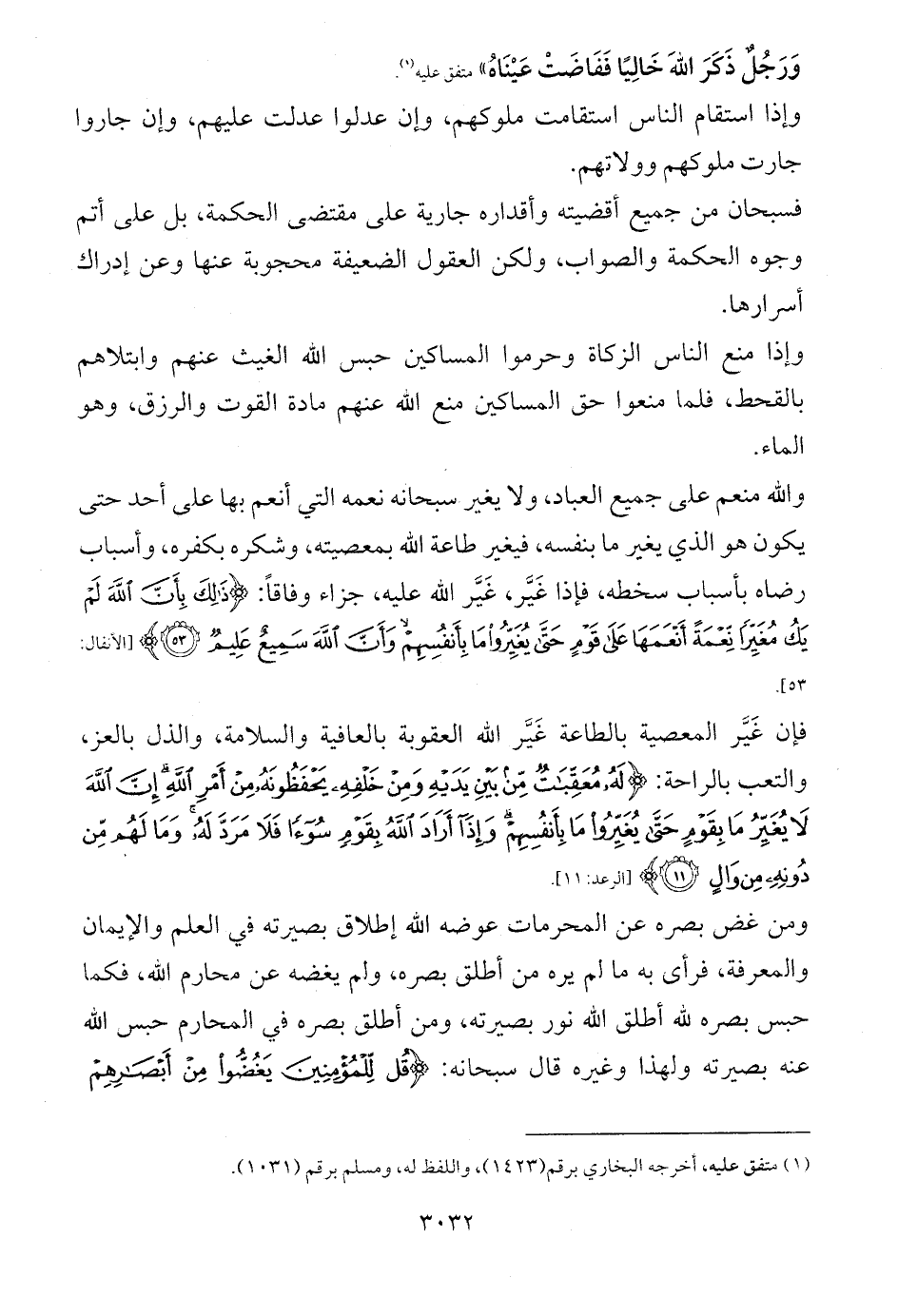 والله منعم على جميع العباد، ولا يغير سبحانه نعمه التي أنعم بها على أحد حتى يكون هو الذي يغير ما بنفسه، فيغير طاعة الله بمعصيته، وشكره بكفره، وأسباب رضاه بأسباب سخطه، فإذا غَيَّر، غَيَّر الله عليه، جزاء وفاقاً: {ذَلِكَ بِأَنَّ اللَّهَ لَمْ يَكُ مُغَيِّرًا نِعْمَةً أَنْعَمَهَا عَلَى قَوْمٍ حَتَّى يُغَيِّرُوا مَا بِأَنْفُسِهِمْ وَأَنَّ اللَّهَ سَمِيعٌ عَلِيمٌ (53)} [الأنفال: 53].