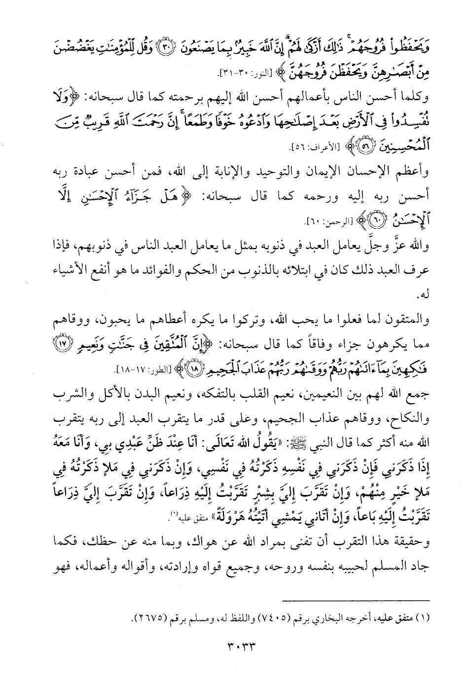 جمع الله لهم بين النعيمين، نعيم القلب بالتفكه، ونعيم البدن بالأكل والشرب والنكاح، ووقاهم عذاب الجحيم، وعلى قدر ما يتقرب العبد إلى ربه يتقرب الله منه أكثر كما قال النبي - صلى الله عليه وسلم -: «يَقُولُ الله تَعَالَى: أنَا عِنْدَ ظَنِّ عَبْدِي بِي، وَأنَا مَعَهُ إِذَا ذَكَرَنِي فَإِنْ ذَكَرَنِي فِي نَفْسِهِ ذَكَرْتُهُ فِي نَفْسِي، وَإِنْ ذَكَرَنِي فِي مَلإ ذَكَرْتُهُ فِي مَلإ خَيْرٍ مِنْهُمْ، وَإِنْ تَقَرَّبَ إِلَيَّ بِشِبْرٍ تَقَرَّبْتُ إِلَيْهِ ذِرَاعاً، وَإِنْ تَقَرَّبَ إِلَيَّ ذِرَاعاً تَقَرَّبْتُ إِلَيْهِ بَاعاً، وَإِنْ أتَانِي يَمْشِي أتَيْتُهُ هَرْوَلَةً» متفق عليه (¬1).