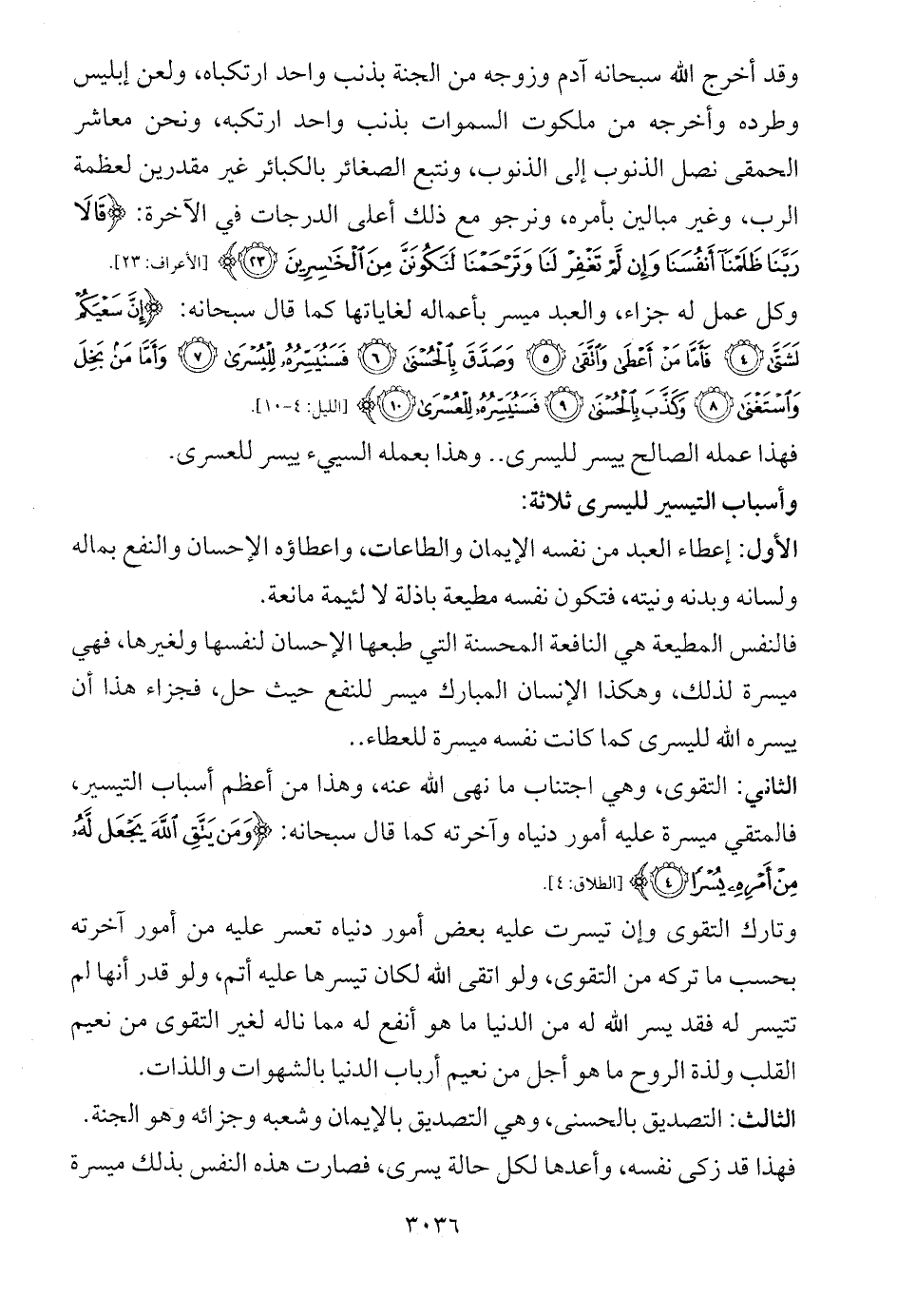 الثاني: التقوى، وهي اجتناب ما نهى الله عنه، وهذا من أعظم أسباب التيسير، فالمتقي ميسرة عليه أمور دنياه وآخرته كما قال سبحانه: {وَمَنْ يَتَّقِ اللَّهَ يَجْعَلْ لَهُ مِنْ أَمْرِهِ يُسْرًا (4)} [الطلاق: 4].