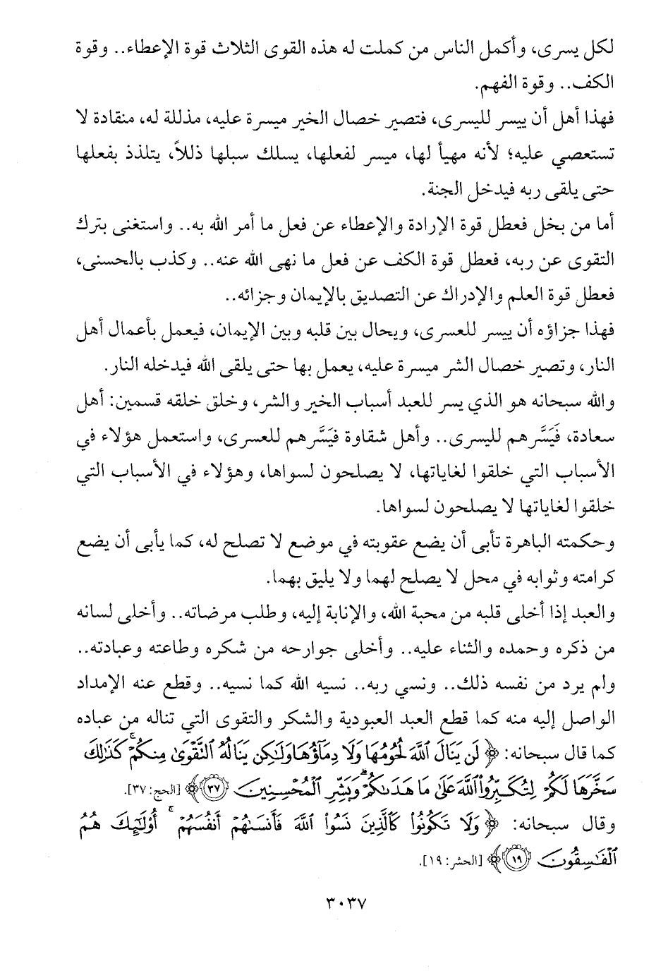 والله سبحانه هو الذي يسر للعبد أسباب الخير والشر، وخلق خلقه قسمين: أهل سعادة، فَيَسَّرهم لليسرى .. وأهل شقاوة فيَسَّرهم للعسرى، واستعمل هؤلاء في الأسباب التي خلقوا لغاياتها، لا يصلحون لسواها، وهؤلاء في الأسباب التي خلقوا لغاياتها لا يصلحون لسواها.