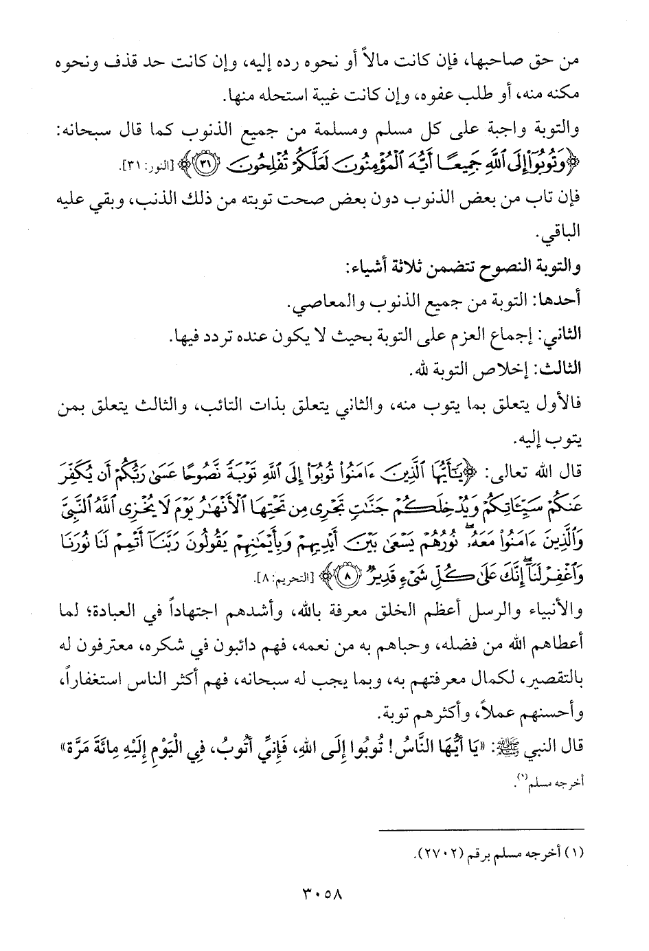 والتوبة النصوح تتضمن ثلاثة أشياء: