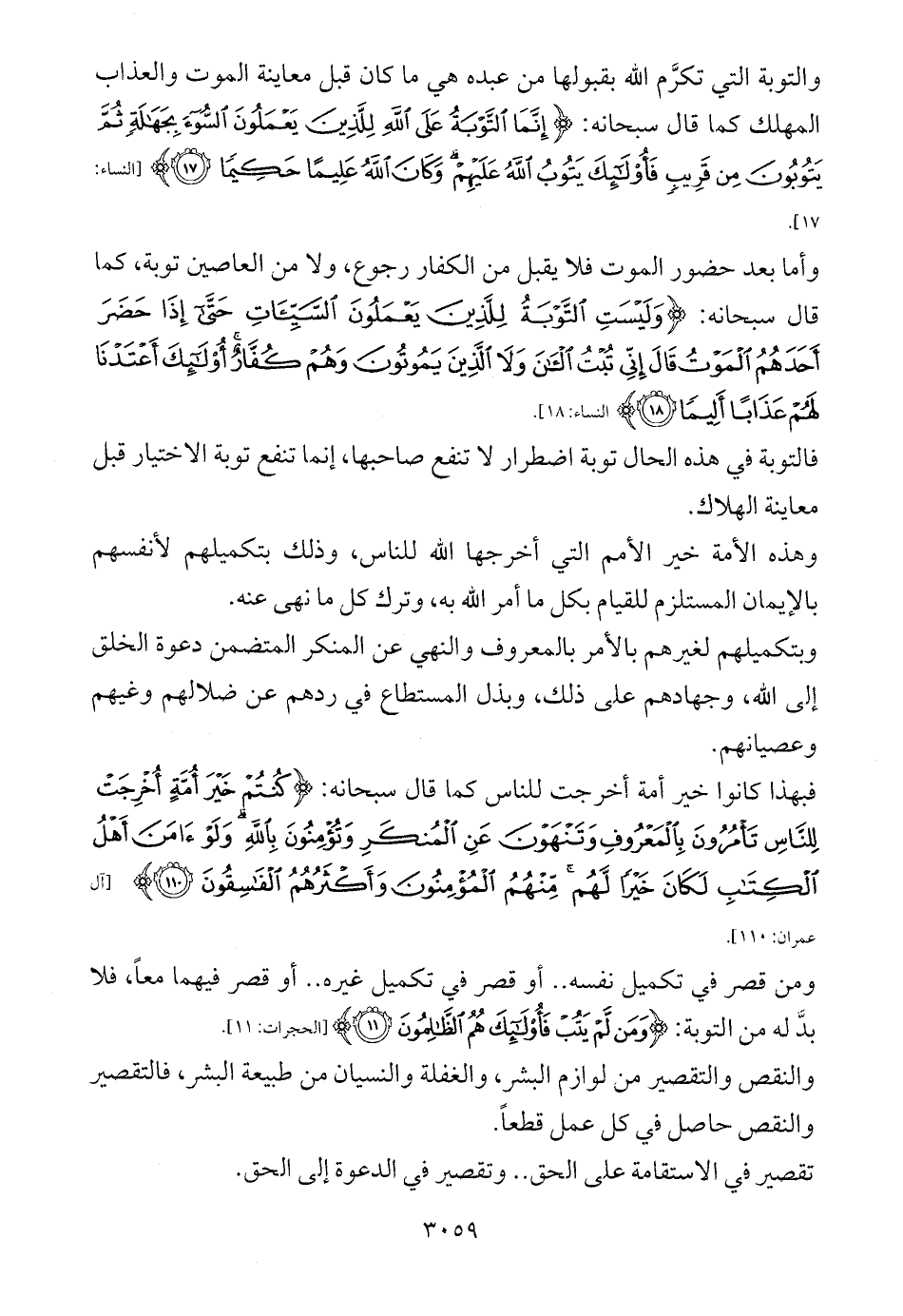 ومن قصر في تكميل نفسه .. أو قصر في تكميل غيره .. أو قصر فيهما معاً، فلا بدَّ له من التوبة: {وَمَنْ لَمْ يَتُبْ فَأُولَئِكَ هُمُ الظَّالِمُونَ (11)} [الحجرات: 11].
