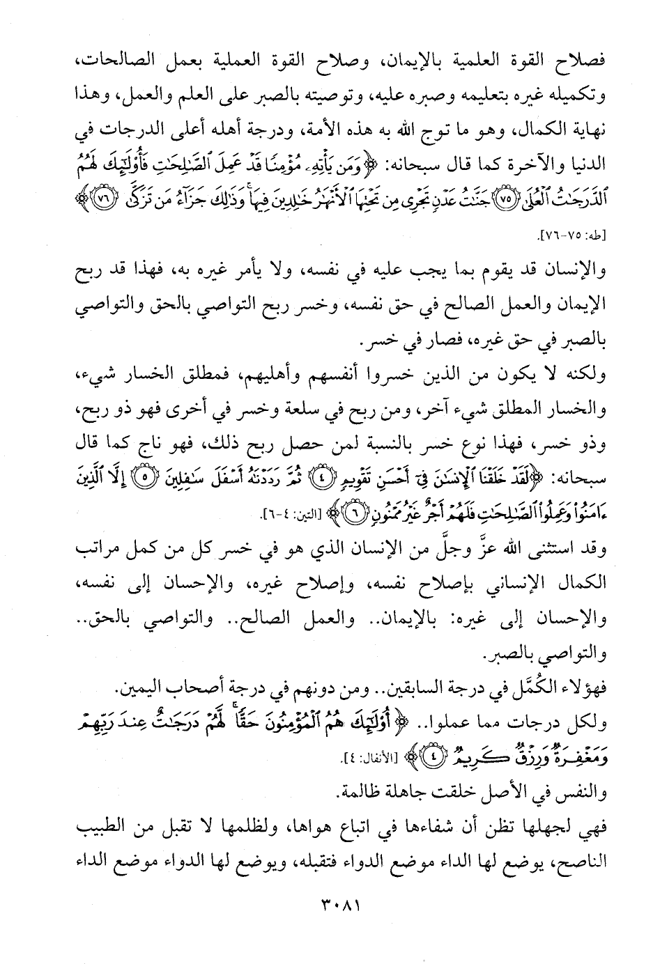 فصلاح القوة العلمية بالإيمان، وصلاح القوة العملية بعمل الصالحات، وتكميله غيره بتعليمه وصبره عليه، وتوصيته بالصبر على العلم والعمل، وهذا نهاية الكمال، وهو ما توج الله به هذه الأمة، ودرجة أهله أعلى الدرجات في الدنيا والآخرة كما قال سبحانه: {وَمَنْ يَأْتِهِ مُؤْمِنًا قَدْ عَمِلَ الصَّالِحَاتِ فَأُولَئِكَ لَهُمُ الدَّرَجَاتُ الْعُلَى (75) جَنَّاتُ عَدْنٍ تَجْرِي مِنْ تَحْتِهَا الْأَنْهَارُ خَالِدِينَ فِيهَا وَذَلِكَ جَزَاءُ مَنْ تَزَكَّى (76)} [طه: 75 - 76].