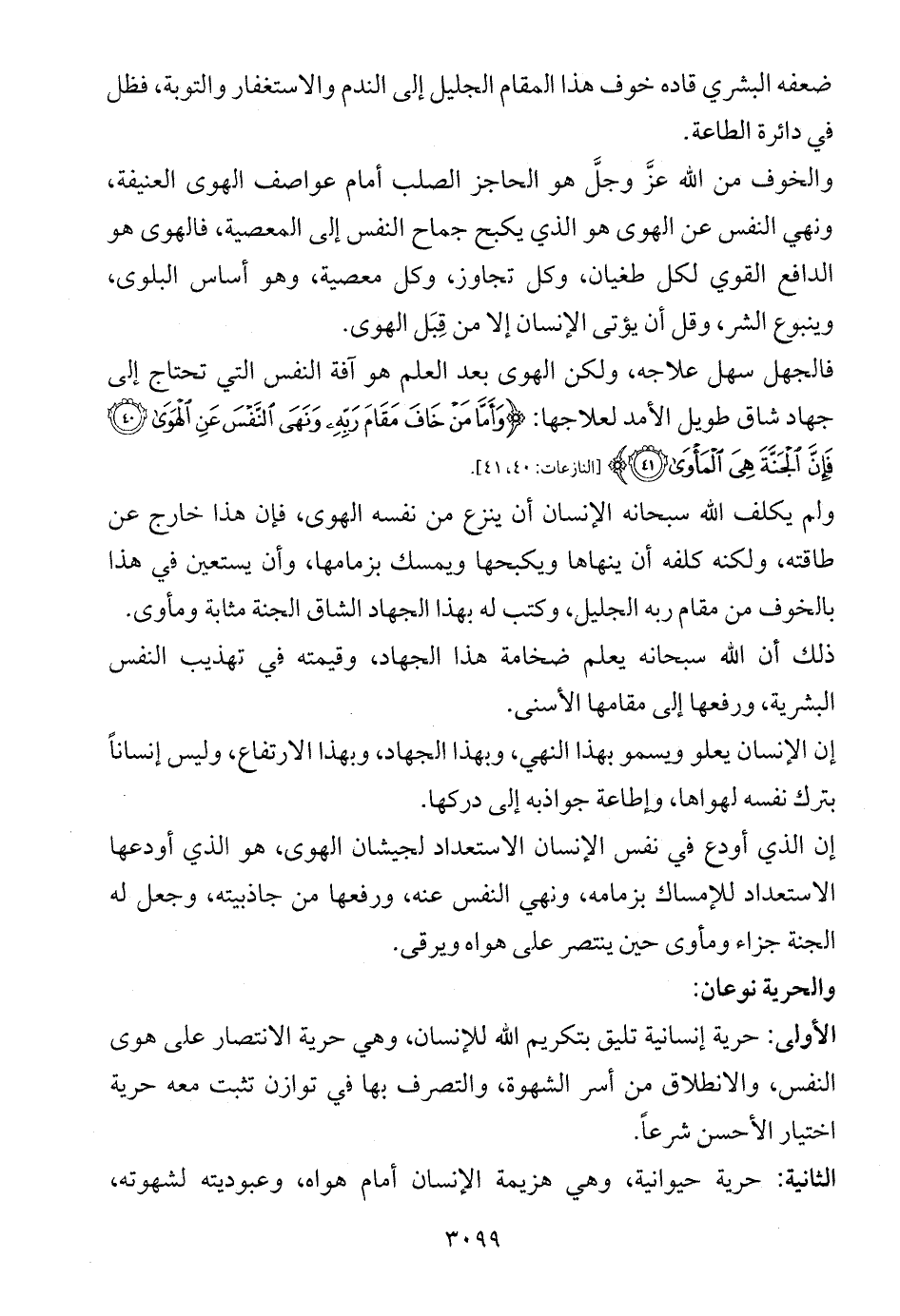 الثانية: حرية حيوانية، وهي هزيمة الإنسان أمام هواه، وعبوديته لشهوته،