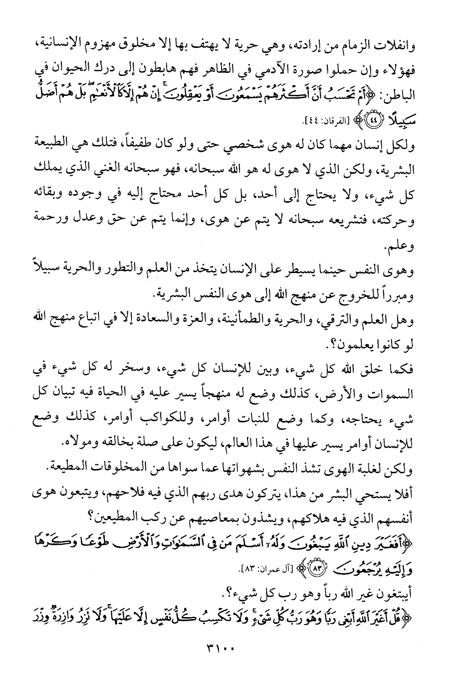 وانفلات الزمام من إرادته، وهي حرية لا يهتف بها إلا مخلوق مهزوم الإنسانية، فهؤلاء وإن حملوا صورة الآدمي في الظاهر فهم هابطون إلى درك الحيوان في الباطن: {أَمْ تَحْسَبُ أَنَّ أَكْثَرَهُمْ يَسْمَعُونَ أَوْ يَعْقِلُونَ إِنْ هُمْ إِلَّا كَالْأَنْعَامِ بَلْ هُمْ أَضَلُّ سَبِيلًا (44)} [الفرقان: 44].
