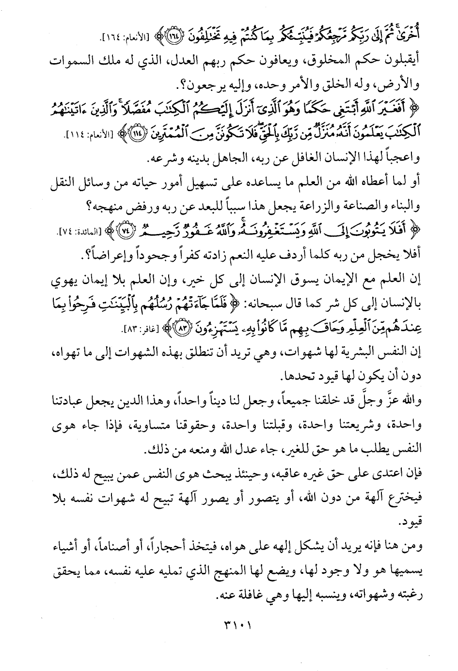 والله عزَّ وجلَّ قد خلقنا جميعاً، وجعل لنا ديناً واحداً، وهذا الدين يجعل عبادتنا واحدة، وشريعتنا واحدة، وقبلتنا واحدة، وحقوقنا متساوية، فإذا جاء هوى النفس يطلب ما هو حق للغير، جاء عدل الله ومنعه من ذلك.