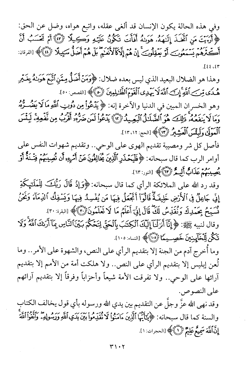 وقد نهى الله عزَّ وجلَّ عن التقديم بين يدي الله ورسوله بأي قول يخالف الكتاب والسنة كما قال سبحانه: {يَاأَيُّهَا الَّذِينَ آمَنُوا لَا تُقَدِّمُوا بَيْنَ يَدَيِ اللَّهِ وَرَسُولِهِ وَاتَّقُوا اللَّهَ إِنَّ اللَّهَ سَمِيعٌ عَلِيمٌ (1)} [الحجرات: 1].
