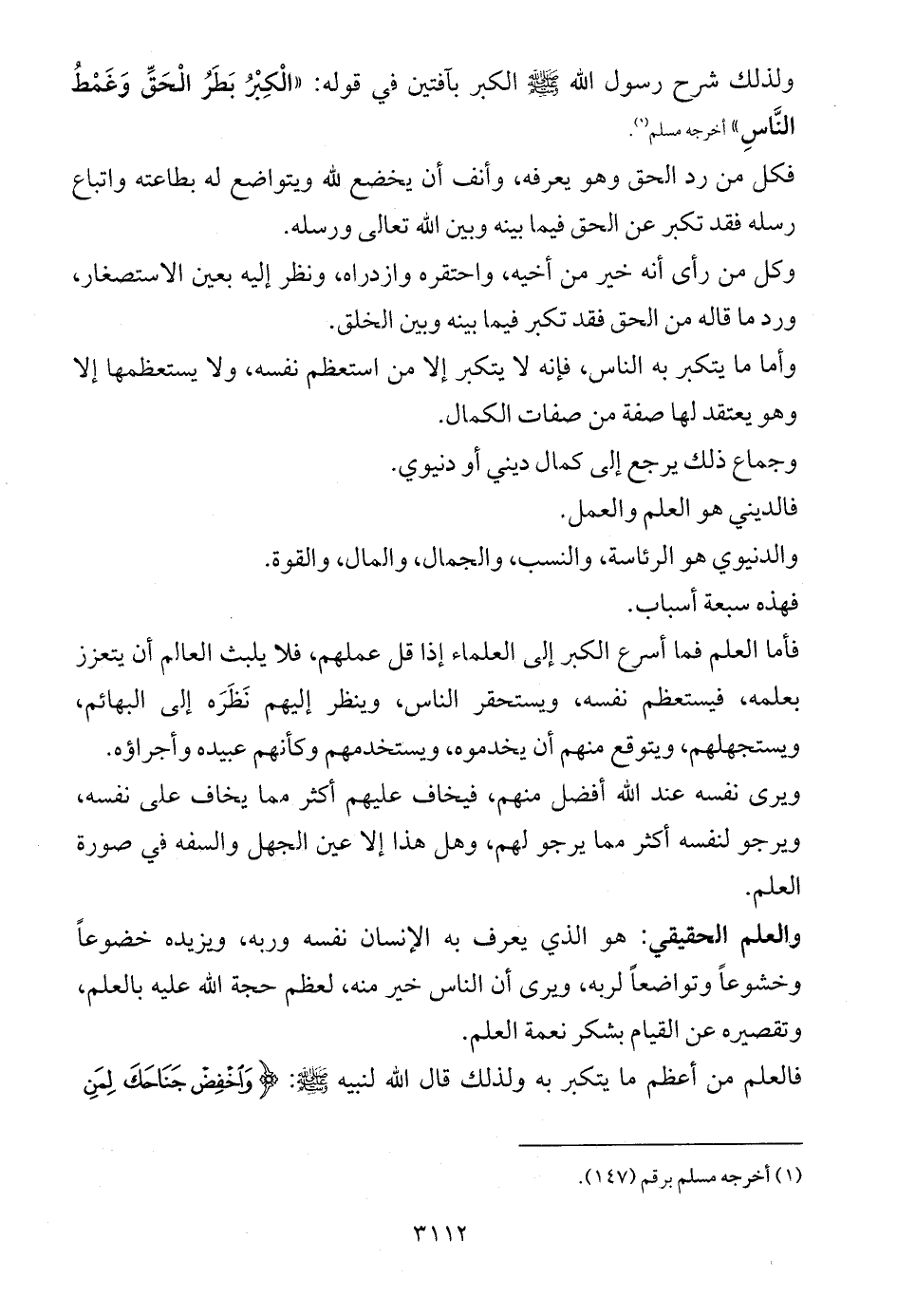 ولذلك شرح رسول الله - صلى الله عليه وسلم - الكبر بآفتين في قوله: «الْكِبْرُ بَطَرُ الْحَقِّ وَغَمْطُ النَّاسِ» أخرجه مسلم (¬1).