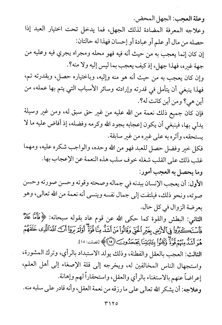 وعلاجه المعرفة المضادة لذلك الجهل، فما يدخل تحت اختيار العبد إذا حصله من مال أو علم أو عبادة أو إحسان فهذا له حالتان: