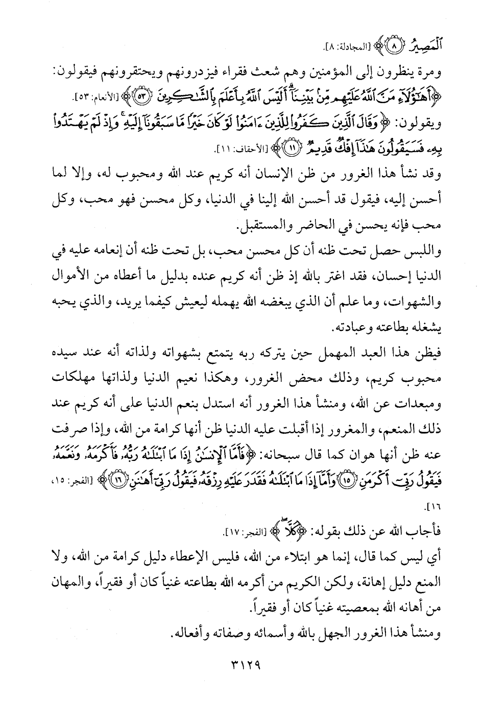 واللبس حصل تحت ظنه أن كل محسن محب، بل تحت ظنه أن إنعامه عليه في الدنيا إحسان، فقد اغتر بالله إذ ظن أنه كريم عنده بدليل ما أعطاه من الأموال والشهوات، وما علم أن الذي يبغضه الله يهمله ليعيش كيفما يريد، والذي يحبه يشغله بطاعته وعبادته.