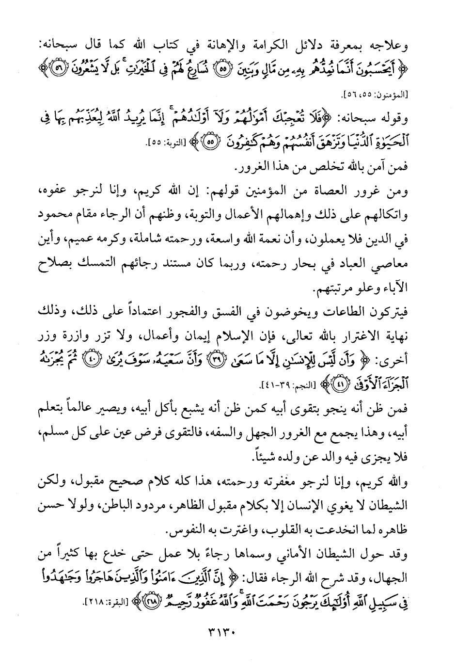 ومن غرور العصاة من المؤمنين قولهم: إن الله كريم، وإنا لنرجو عفوه، واتكالهم على ذلك وإهمالهم الأعمال والتوبة، وظنهم أن الرجاء مقام محمود في الدين فلا يعملون، وأن نعمة الله واسعة، ورحمته شاملة، وكرمه عميم، وأين معاصي العباد في بحار رحمته، وربما كان مستند رجائهم التمسك بصلاح الآباء وعلو مرتبتهم.
