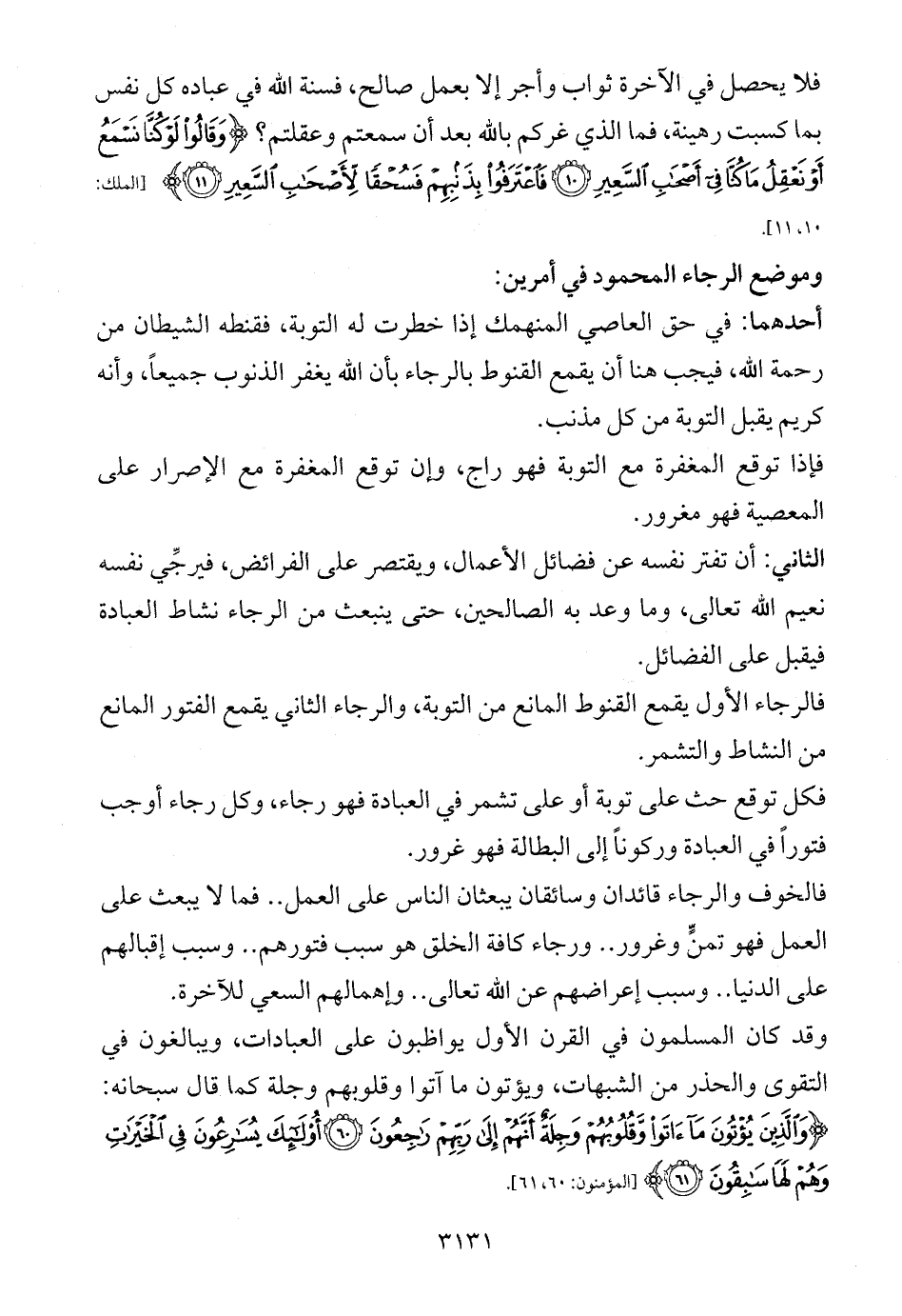 فالرجاء الأول يقمع القنوط المانع من التوبة، والرجاء الثاني يقمع الفتور المانع من النشاط والتشمر.