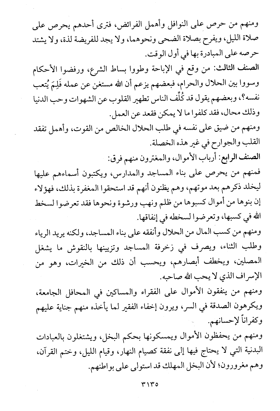 ومنهم من يحفظون الأموال ويمسكونها بحكم البخل، ويشتغلون بالعبادات البدنية التي لا يحتاج فيها إلى نفقة كصيام النهار، وقيام الليل، وختم القرآن، وهم مغرورون؛ لأن البخل المهلك قد استولى على بواطنهم.