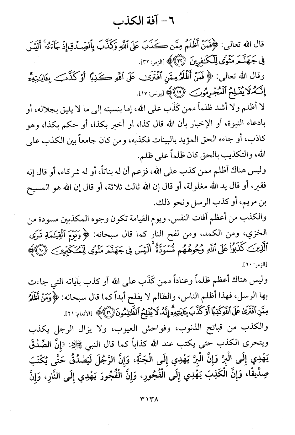 والكذب من أعظم آفات النفس، ويوم القيامة تكون وجوه المكذبين مسودة من الخزي، ومن الكمد، ومن لفح النار كما قال سبحانه: {وَيَوْمَ الْقِيَامَةِ تَرَى الَّذِينَ كَذَبُوا عَلَى اللَّهِ وُجُوهُهُمْ مُسْوَدَّةٌ أَلَيْسَ فِي جَهَنَّمَ مَثْوًى لِلْمُتَكَبِّرِينَ (60)} [الزمر: 60].