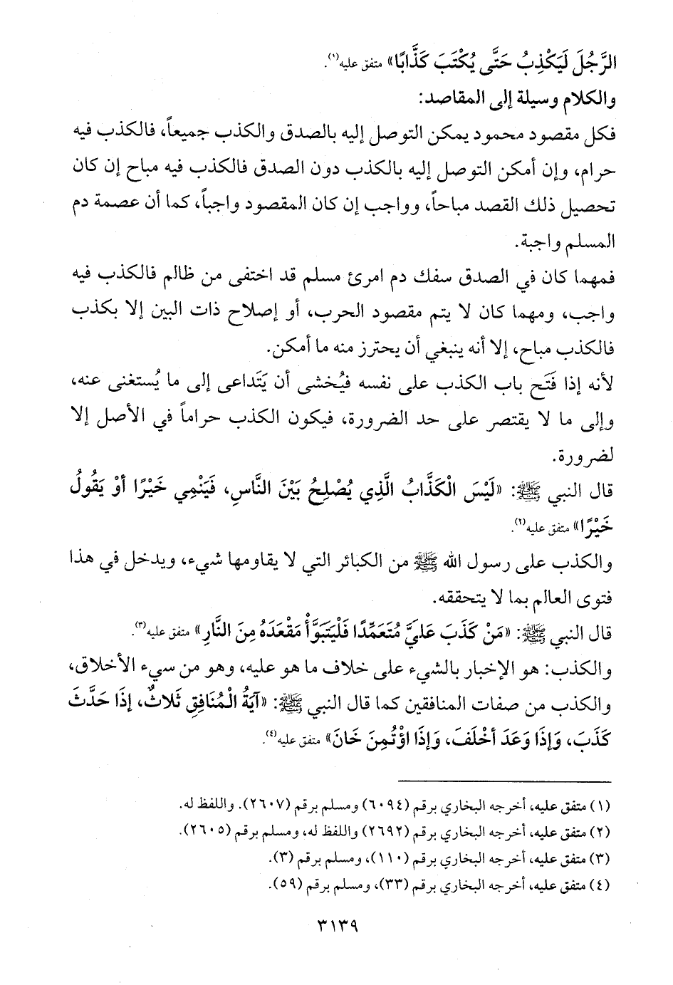 فكل مقصود محمود يمكن التوصل إليه بالصدق والكذب جميعاً، فالكذب فيه حرام، وإن أمكن التوصل إليه بالكذب دون الصدق فالكذب فيه مباح إن كان تحصيل ذلك القصد مباحاً، وواجب إن كان المقصود واجباً، كما أن عصمة دم المسلم واجبة.