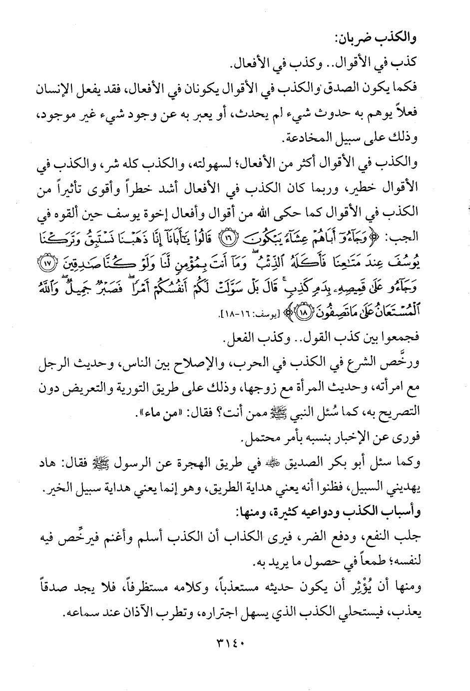 والكذب في الأقوال أكثر من الأفعال؛ لسهولته، والكذب كله شر، والكذب في الأقوال خطير، وربما كان الكذب في الأفعال أشد خطراً وأقوى تأثيراً من الكذب في الأقوال كما حكى الله من أقوال وأفعال إخوة يوسف حين ألقوه في الجب: {وَجَاءُوا أَبَاهُمْ عِشَاءً يَبْكُونَ (16) قَالُوا يَاأَبَانَا إِنَّا ذَهَبْنَا نَسْتَبِقُ وَتَرَكْنَا يُوسُفَ عِنْدَ مَتَاعِنَا فَأَكَلَهُ الذِّئْبُ وَمَا أَنْتَ بِمُؤْمِنٍ لَنَا وَلَوْ كُنَّا صَادِقِينَ (17) وَجَاءُوا عَلَى قَمِيصِهِ بِدَمٍ كَذِبٍ قَالَ بَلْ سَوَّلَتْ لَكُمْ أَنْفُسُكُمْ أَمْرًا فَصَبْرٌ جَمِيلٌ وَاللَّهُ الْمُسْتَعَانُ عَلَى مَا تَصِفُونَ (18)} [يوسف: 16 - 18].