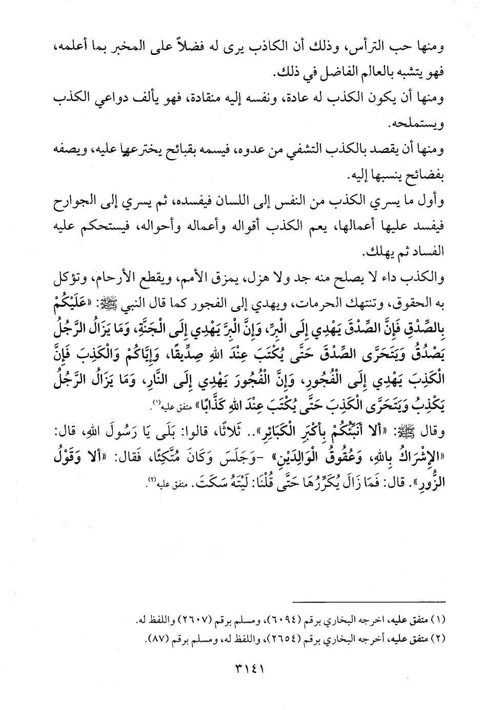 والكذب داء لا يصلح منه جد ولا هزل، يمزق الأمم، ويقطع الأرحام، وتؤكل به الحقوق، وتنتهك الحرمات، ويهدي إلى الفجور كما قال النبي - صلى الله عليه وسلم -: «عَلَيْكُمْ بِالصِّدْقِ فَإِنَّ الصِّدْقَ يَهْدِي إِلَى الْبِرِّ، وَإِنَّ الْبِرَّ يَهْدِي إِلَى الْجَنَّةِ، وَمَا يَزَالُ الرَّجُلُ يَصْدُقُ وَيَتَحَرَّى الصِّدْقَ حَتَّى يُكْتَبَ عِنْدَ اللهِ صِدِّيقًا، وَإِيَّاكُمْ وَالْكَذِبَ فَإِنَّ الْكَذِبَ يَهْدِي إِلَى الْفُجُورِ، وَإِنَّ الْفُجُورَ يَهْدِي إِلَى النَّارِ، وَمَا يَزَالُ الرَّجُلُ يَكْذِبُ وَيَتَحَرَّى الْكَذِبَ حَتَّى يُكْتَبَ عِنْدَ اللهِ كَذَّابًا» متفق عليه (¬1).