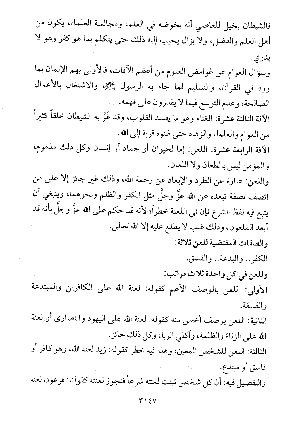 الآفة الرابعة عشرة: اللعن: إما لحيوان أو جماد أو إنسان وكل ذلك مذموم، والمؤمن ليس بالطعان ولا اللعان.