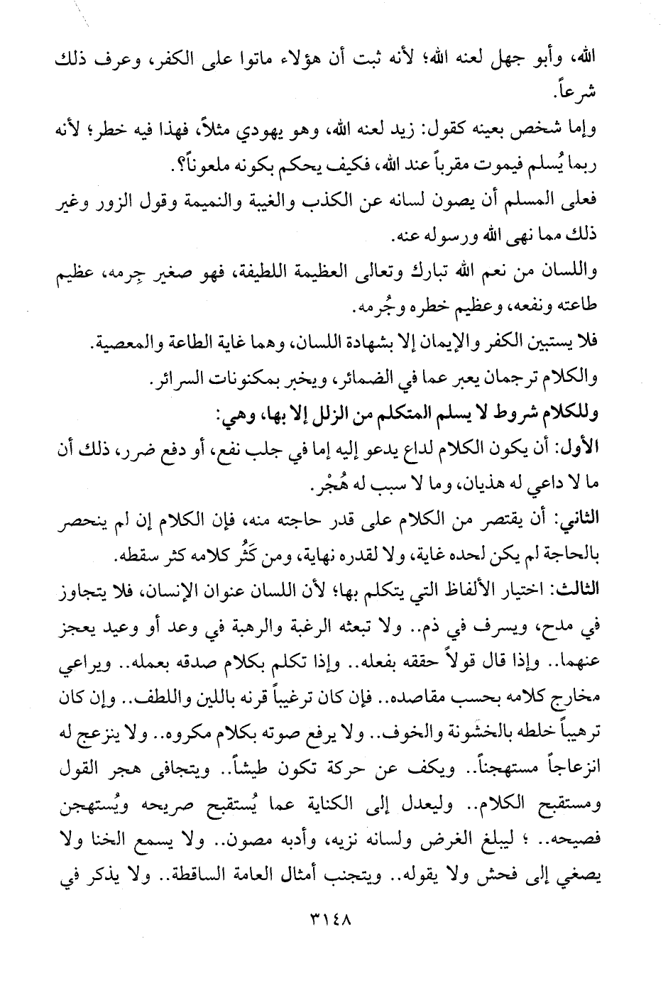 الثاني: أن يقتصر من الكلام على قدر حاجته منه، فإن الكلام إن لم ينحصر بالحاجة لم يكن لحده غاية، ولا لقدره نهاية، ومن كَثُر كلامه كثر سقطه.
