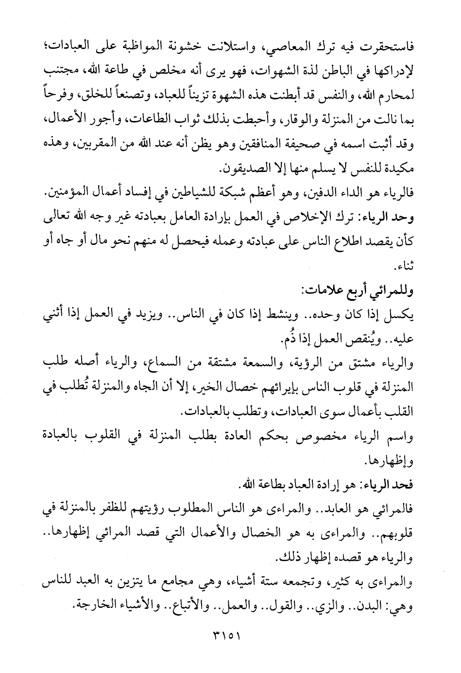 فاستحقرت فيه ترك المعاصي، واستلانت خشونة المواظبة على العبادات؛ لإدراكها في الباطن لذة الشهوات، فهو يرى أنه مخلص في طاعة الله، مجتنب لمحارم الله، والنفس قد أبطنت هذه الشهوة تزيناً للعباد، وتصنعاً للخلق، وفرحاً بما نالت من المنزلة والوقار، وأحبطت بذلك ثواب الطاعات، وأجور الأعمال، وقد أثبت اسمه في صحيفة المنافقين وهو يظن أنه عند الله من المقربين، وهذه مكيدة للنفس لا يسلم منها إلا الصديقون.