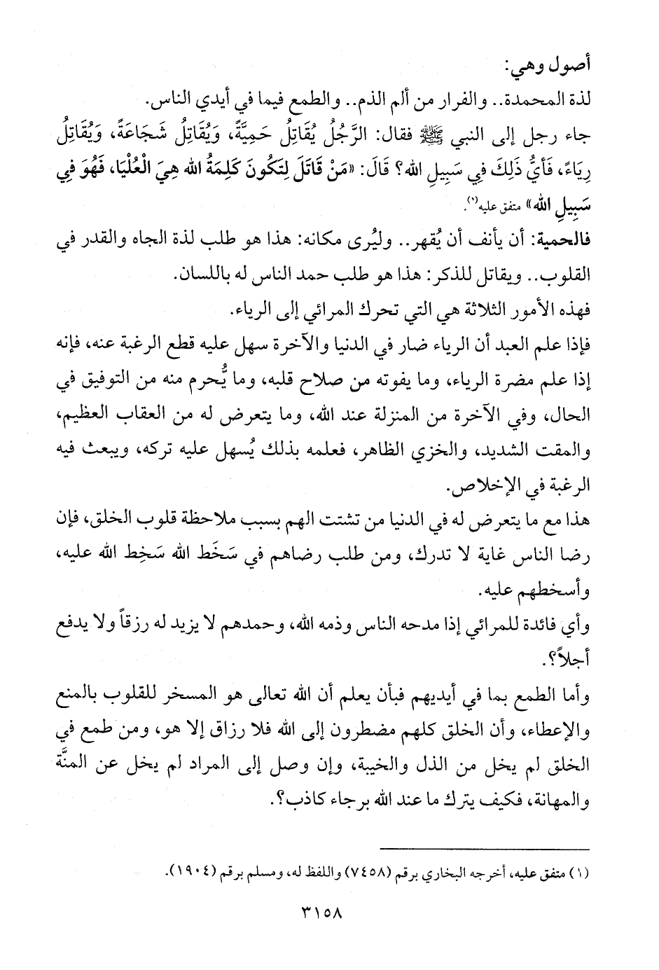 جاء رجل إلى النبي - صلى الله عليه وسلم - فقال: الرَّجُلُ يُقَاتِلُ حَمِيَّةً، وَيُقَاتِلُ شَجَاعَةً، وَيُقَاتِلُ رِيَاءً، فَأيُّ ذَلِكَ فِي سَبِيلِ الله؟ قَالَ: «مَنْ قَاتَلَ لِتَكُونَ كَلِمَةُ الله هِيَ الْعُلْيَا، فَهُوَ فِي سَبِيلِ الله» متفق عليه (¬1).