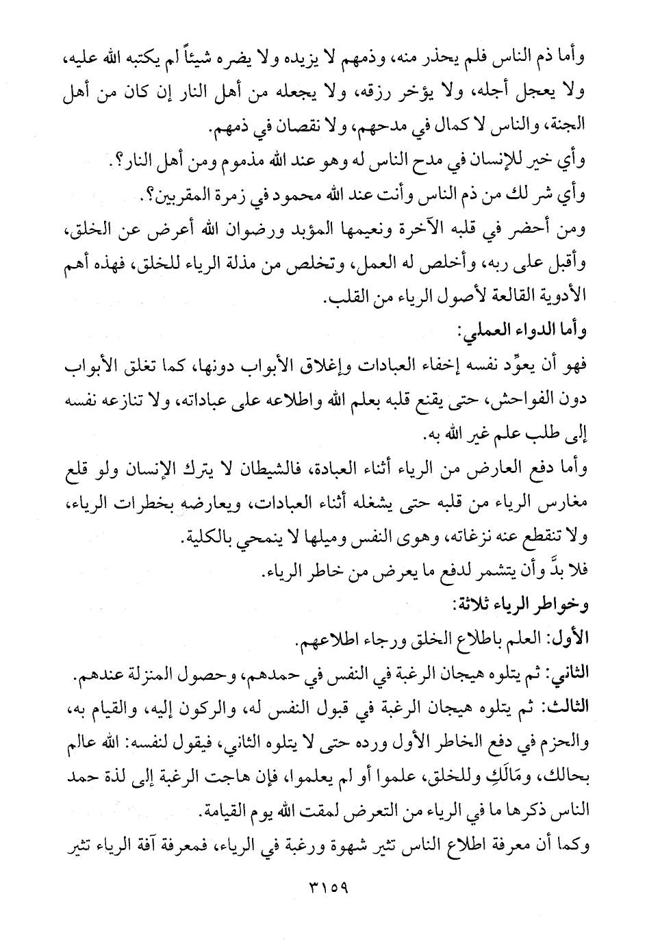 ومن أحضر في قلبه الآخرة ونعيمها المؤبد ورضوان الله أعرض عن الخلق، وأقبل على ربه، وأخلص له العمل، وتخلص من مذلة الرياء للخلق، فهذه أهم الأدوية القالعة لأصول الرياء من القلب.