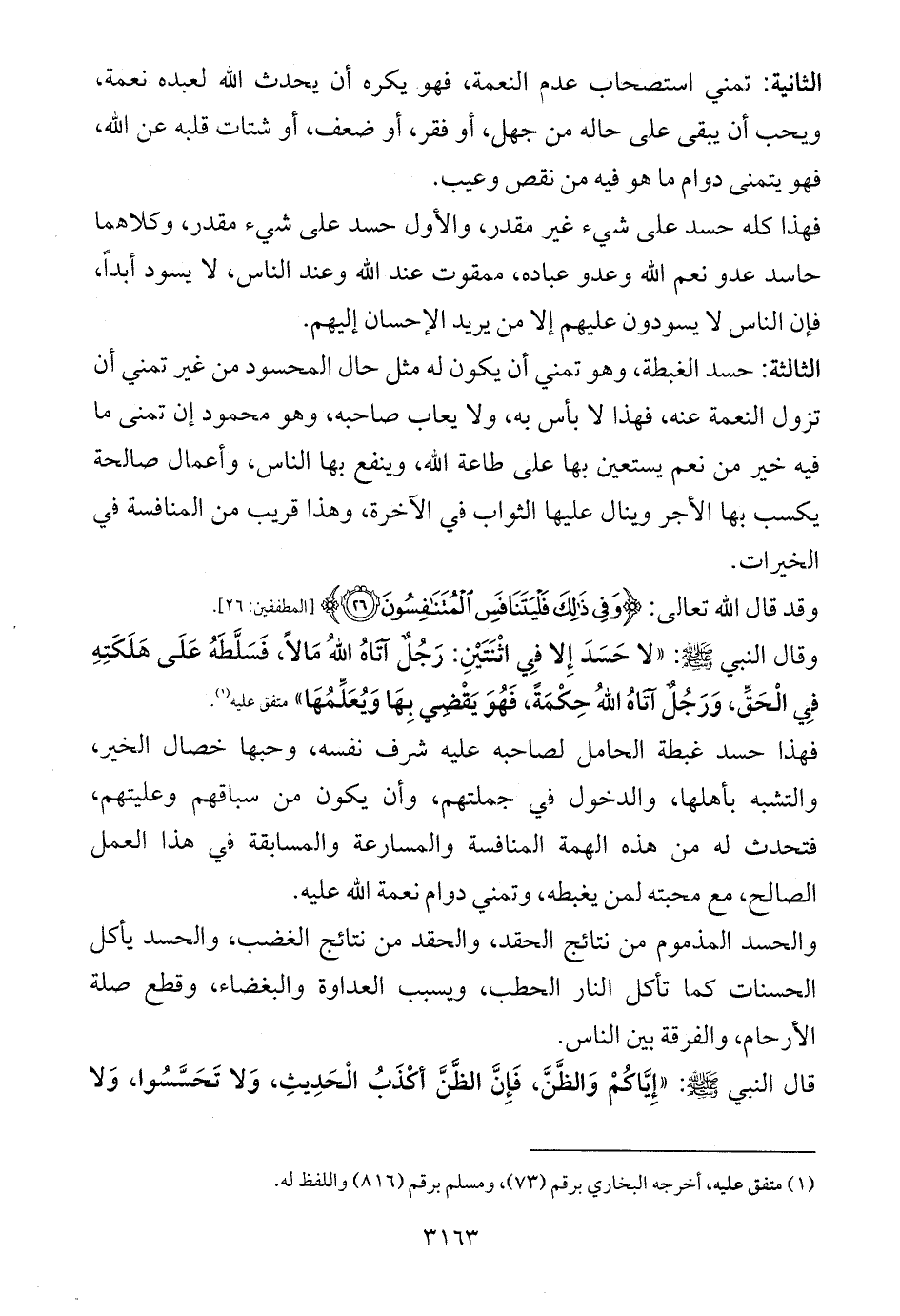 وقال النبي - صلى الله عليه وسلم -: «لا حَسَدَ إِلا فِي اثْنَتَيْنِ: رَجُلٌ آتَاهُ اللهُ مَالاً، فَسَلَّطَهُ عَلَى هَلَكَتِهِ فِي الْحَقِّ، وَرَجُلٌ آتَاهُ اللهُ حِكْمَةً، فَهُوَ يَقْضِي بِهَا وَيُعَلِّمُهَا» متفق عليه (¬1).