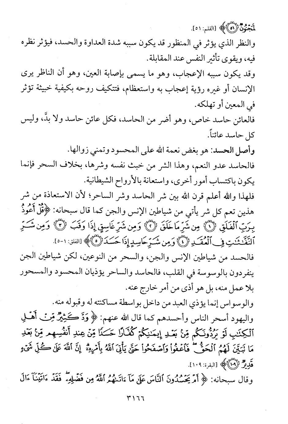 فلهذا والله أعلم قرن الله بين شر الحاسد وشر الساحر؛ لأن الاستعاذة من شر هذين تعم كل شر يأتي من شياطين الإنس والجن كما قال سبحانه: {قُلْ أَعُوذُ بِرَبِّ الْفَلَقِ (1) مِنْ شَرِّ مَا خَلَقَ (2) وَمِنْ شَرِّ غَاسِقٍ إِذَا وَقَبَ (3) وَمِنْ شَرِّ النَّفَّاثَاتِ فِي الْعُقَدِ (4) وَمِنْ شَرِّ حَاسِدٍ إِذَا حَسَدَ (5)} [الفلق: 1 - 5].