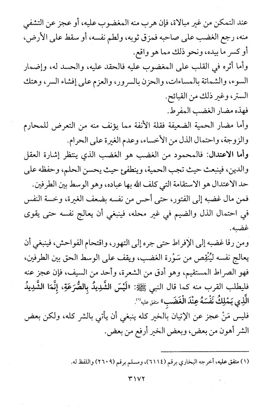ومن رقا غضبه إلى الإفراط حتى جره إلى التهور، واقتحام الفواحش، فينبغي أن يعالج نفسه ليُنْقِص من سَوْرة الغضب، ويقف على الوسط الحق بين الطرفين، فهو الصراط المستقيم، وهو أدق من الشعرة، وأحد من السيف، فإن عجز عنه فليطلب القرب منه كما قال النبي - صلى الله عليه وسلم -: «لَيْسَ الشَّدِيدُ بِالصُّرَعَةِ، إِنَّمَا الشَّدِيدُ الَّذِي يَمْلِكُ نَفْسَهُ عِنْدَ الْغَضَبِ» متفق عليه (¬1).