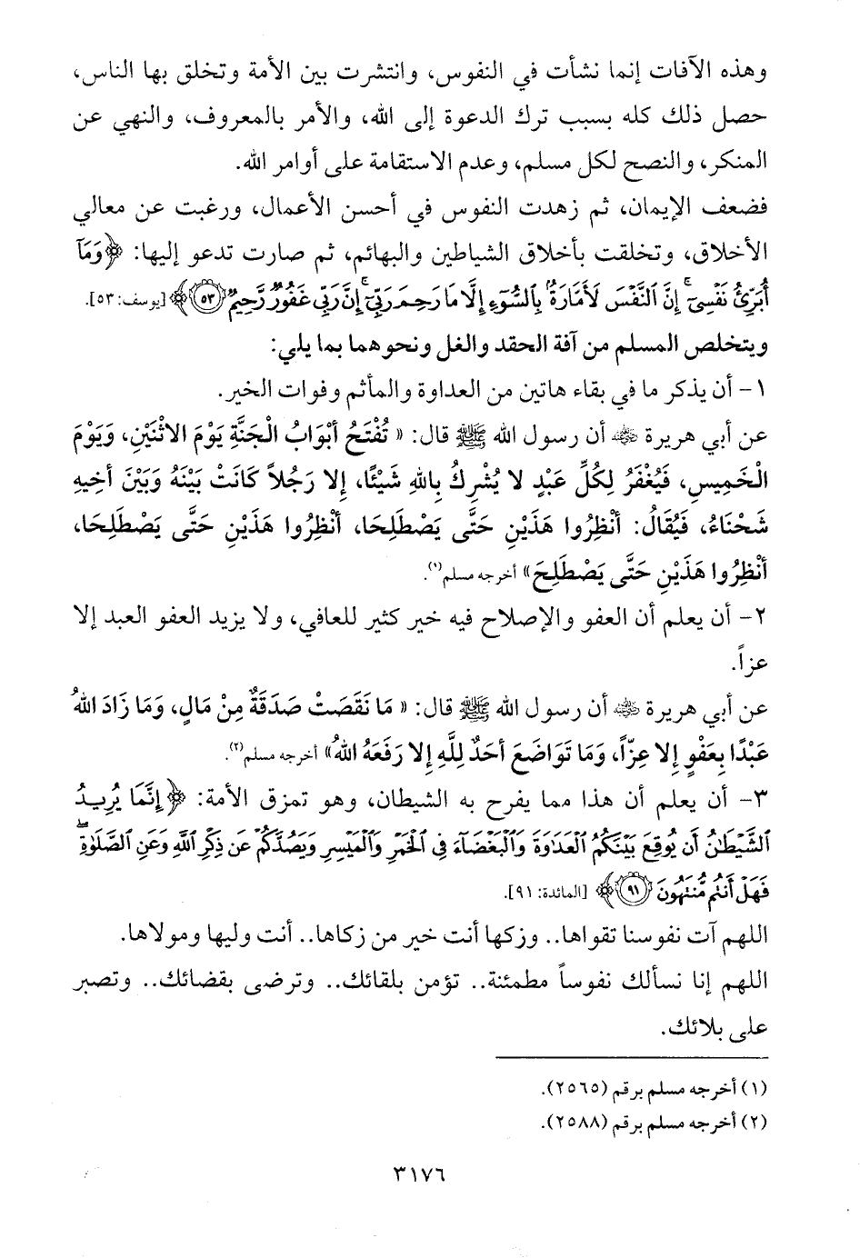 وهذه الآفات إنما نشأت في النفوس، وانتشرت بين الأمة وتخلق بها الناس، حصل ذلك كله بسبب ترك الدعوة إلى الله، والأمر بالمعروف، والنهي عن المنكر، والنصح لكل مسلم، وعدم الاستقامة على أوامر الله.