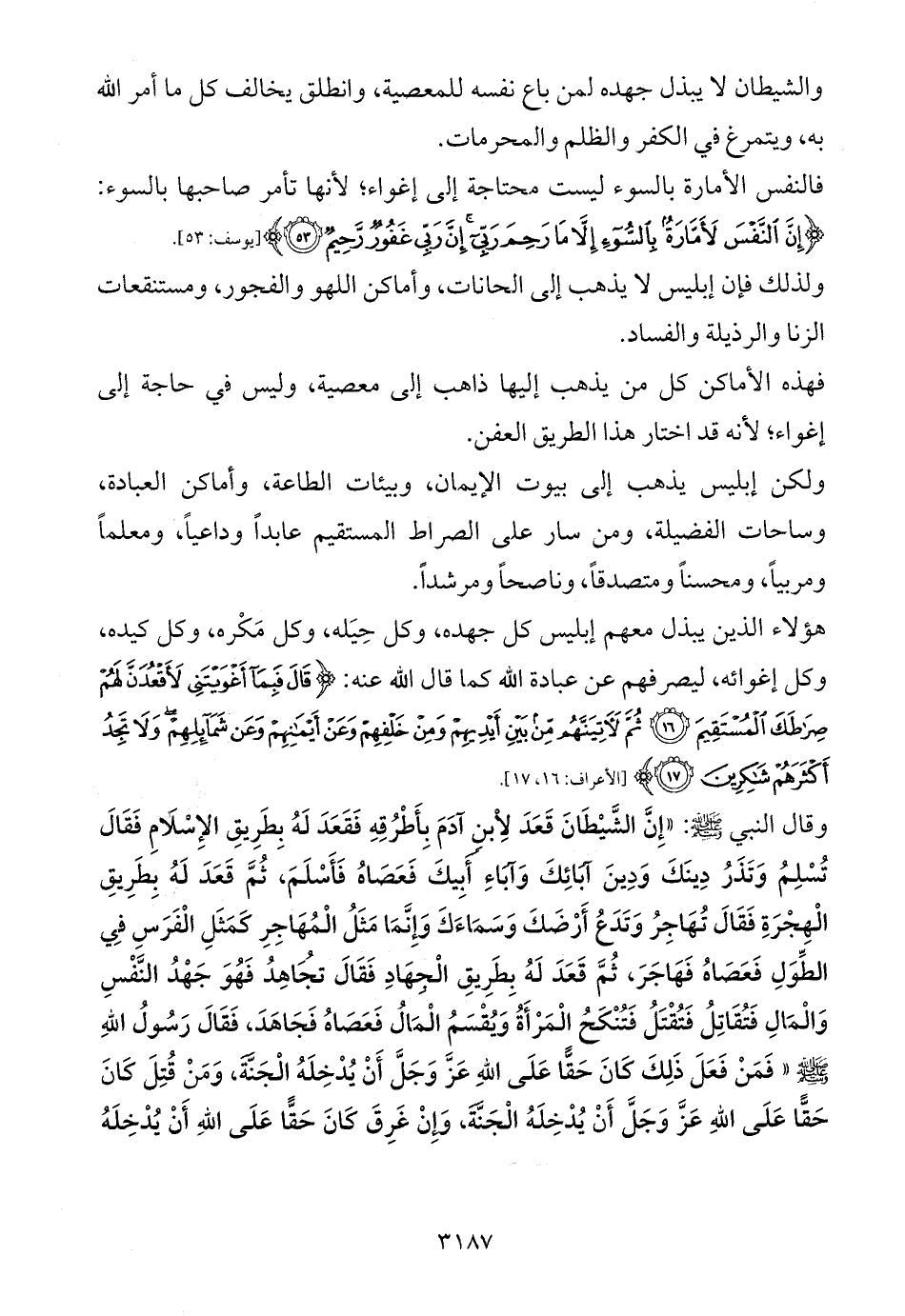 وقال النبي - صلى الله عليه وسلم -: «إِنَّ الشَّيْطَانَ قَعَدَ لاِْبنِِ آدَمَ بِأَطْرُقِهِ فَقَعَدَ لَهُ بِطَرِيقِ الإِسْلَامِ فَقَالَ تُسْلِمُ وَتَذَرُ دِينَكَ وَدِينَ آبَائِكَ وَآبَاءِ أَبِيكَ فَعَصَاهُ فَأَسْلَمَ، ثُمَّ قَعَدَ لَهُ بِطَرِيقِ الْهِجْرَةِ فَقَالَ تُهَاجِرُ وَتَدَعُ أَرْضَكَ وَسَمَاءَكَ وَإِنَّمَا مَثَلُ الْمُهَاجِرِ كَمَثَلِ الْفَرَسِ فِي الطِّوَلِ فَعَصَاهُ فَهَاجَرَ، ثُمَّ قَعَدَ لَهُ بِطَرِيقِ الْجِهَادِ فَقَالَ تُجَاهِدُ فَهُوَ جَهْدُ النَّفْسِ وَالْمَالِ فَتُقَاتِلُ فَتُقْتَلُ فَتُنْكَحُ الْمَرْأَةُ وَيُقْسَمُ الْمَالُ فَعَصَاهُ فَجَاهَدَ، فَقَالَ رَسُولُ اللهِ («فَمَنْ فَعَلَ ذَلِكَ كَانَ حَقًّا عَلَى اللهِ عَزَّ وَجَلَّ أَنْ يُدْخِلَهُ الْجَنَّةَ، وَمَنْ قُتِلَ كَانَ حَقًّا عَلَى اللهِ عَزَّ وَجَلَّ أَنْ يُدْخِلَهُ الْجَنَّةَ، وَإِنْ غَرِقَ كَانَ حَقًّا عَلَى اللهِ أَنْ يُدْخِلَهُ