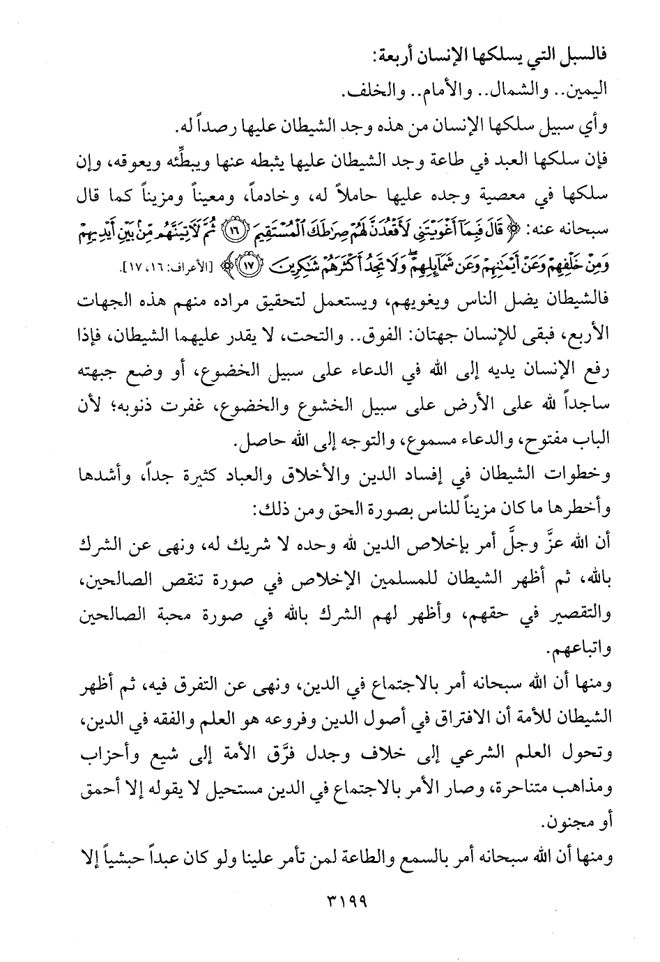 فإن سلكها العبد في طاعة وجد الشيطان عليها يثبطه عنها ويبطِّئه ويعوقه، وإن سلكها في معصية وجده عليها حاملاً له، وخادماً، ومعيناً ومزيناً كما قال سبحانه عنه: {قَالَ فَبِمَا أَغْوَيْتَنِي لَأَقْعُدَنَّ لَهُمْ صِرَاطَكَ الْمُسْتَقِيمَ (16) ثُمَّ لَآتِيَنَّهُمْ مِنْ بَيْنِ أَيْدِيهِمْ وَمِنْ خَلْفِهِمْ وَعَنْ أَيْمَانِهِمْ وَعَنْ شَمَائِلِهِمْ وَلَا تَجِدُ أَكْثَرَهُمْ شَاكِرِينَ (17)} ... [الأعراف: 16، 17].