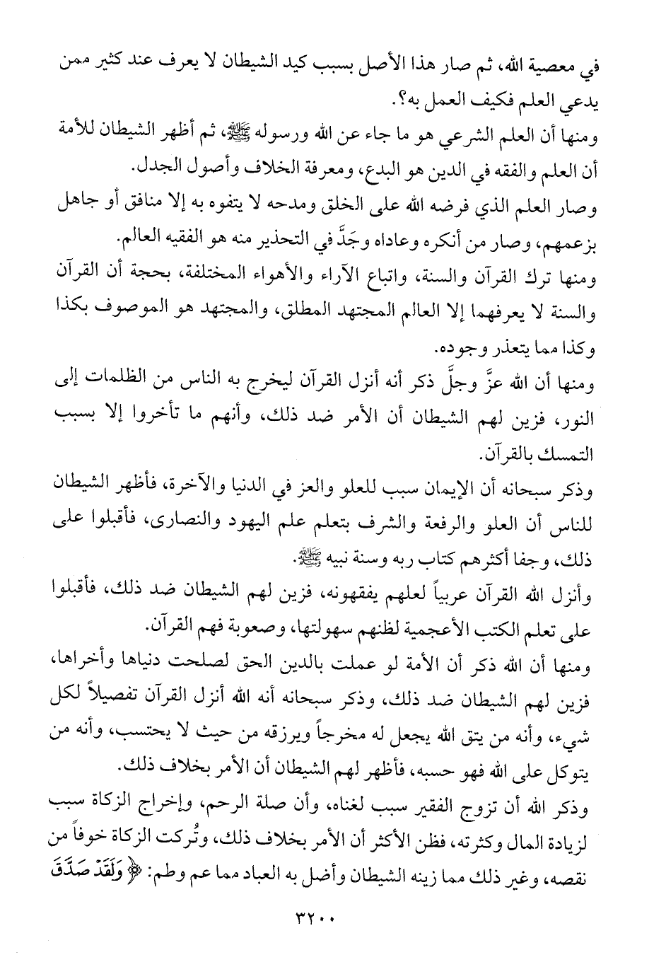 ومنها أن العلم الشرعي هو ما جاء عن الله ورسوله (، ثم أظهر الشيطان للأمة أن العلم والفقه في الدين هو البدع، ومعرفة الخلاف وأصول الجدل.