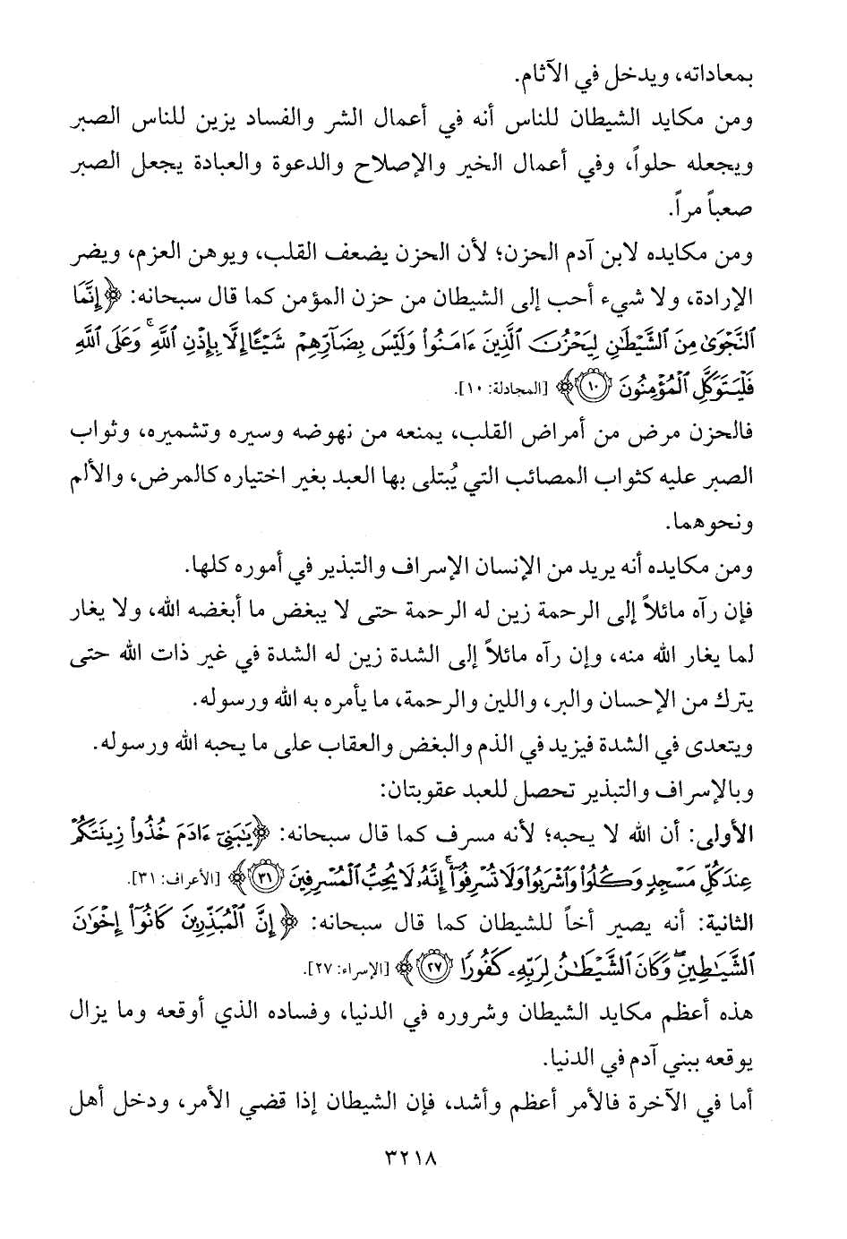 ومن مكايده لابن آدم الحزن؛ لأن الحزن يضعف القلب، ويوهن العزم، ويضر الإرادة، ولا شيء أحب إلى الشيطان من حزن المؤمن كما قال سبحانه: {إِنَّمَا النَّجْوَى مِنَ الشَّيْطَانِ لِيَحْزُنَ الَّذِينَ آمَنُوا وَلَيْسَ بِضَارِّهِمْ شَيْئًا إِلَّا بِإِذْنِ اللَّهِ وَعَلَى اللَّهِ فَلْيَتَوَكَّلِ الْمُؤْمِنُونَ (10)} [المجادلة: 10].