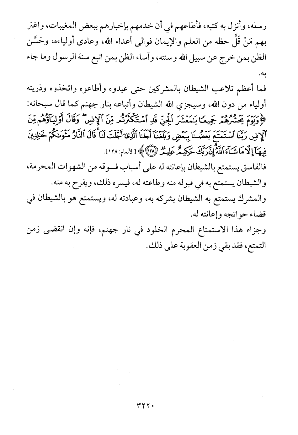 فما أعظم تلاعب الشيطان بالمشركين حتى عبدوه وأطاعوه واتخذوه وذريته أولياء من دون الله، وسيجزي الله الشيطان وأتباعه بنار جهنم كما قال سبحانه: {وَيَوْمَ يَحْشُرُهُمْ جَمِيعًا يَامَعْشَرَ الْجِنِّ قَدِ اسْتَكْثَرْتُمْ مِنَ الْإِنْسِ وَقَالَ أَوْلِيَاؤُهُمْ مِنَ الْإِنْسِ رَبَّنَا اسْتَمْتَعَ بَعْضُنَا بِبَعْضٍ وَبَلَغْنَا أَجَلَنَا الَّذِي أَجَّلْتَ لَنَا قَالَ النَّارُ مَثْوَاكُمْ خَالِدِينَ فِيهَا إِلَّا مَا شَاءَ اللَّهُ إِنَّ رَبَّكَ حَكِيمٌ عَلِيمٌ (128)} [الأنعام: 128].