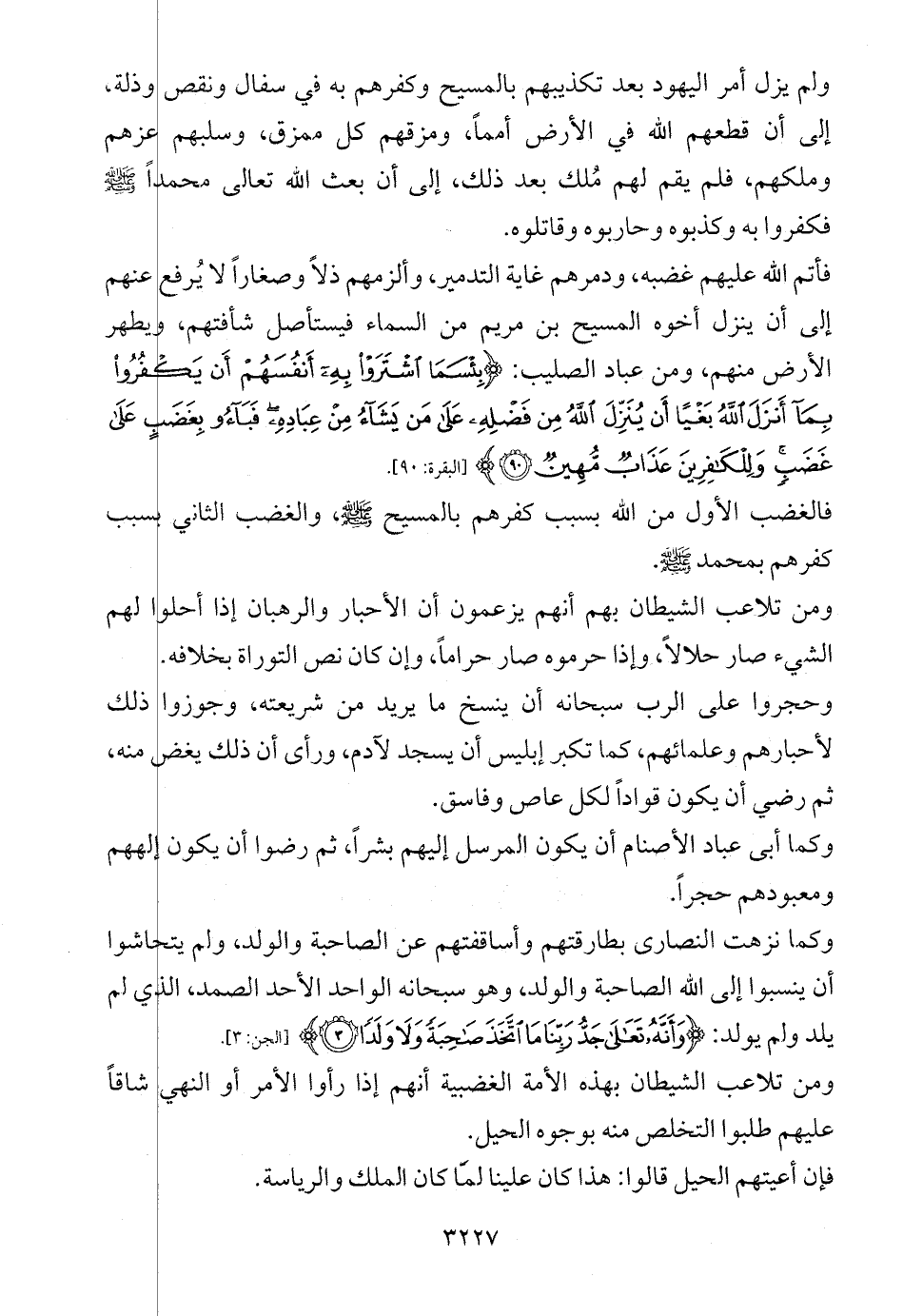 فأتم الله عليهم غضبه، ودمرهم غاية التدمير، وألزمهم ذلاً وصغاراً لا يُرفع عنهم إلى أن ينزل أخوه المسيح بن مريم من السماء فيستأصل شأفتهم، ويطهر الأرض منهم، ومن عباد الصليب: {بِئْسَمَا اشْتَرَوْا بِهِ أَنْفُسَهُمْ أَنْ يَكْفُرُوا بِمَا أَنْزَلَ اللَّهُ بَغْيًا أَنْ يُنَزِّلَ اللَّهُ مِنْ فَضْلِهِ عَلَى مَنْ يَشَاءُ مِنْ عِبَادِهِ فَبَاءُوا بِغَضَبٍ عَلَى غَضَبٍ وَلِلْكَافِرِينَ عَذَابٌ مُهِينٌ (90)} ... [البقرة: 90].