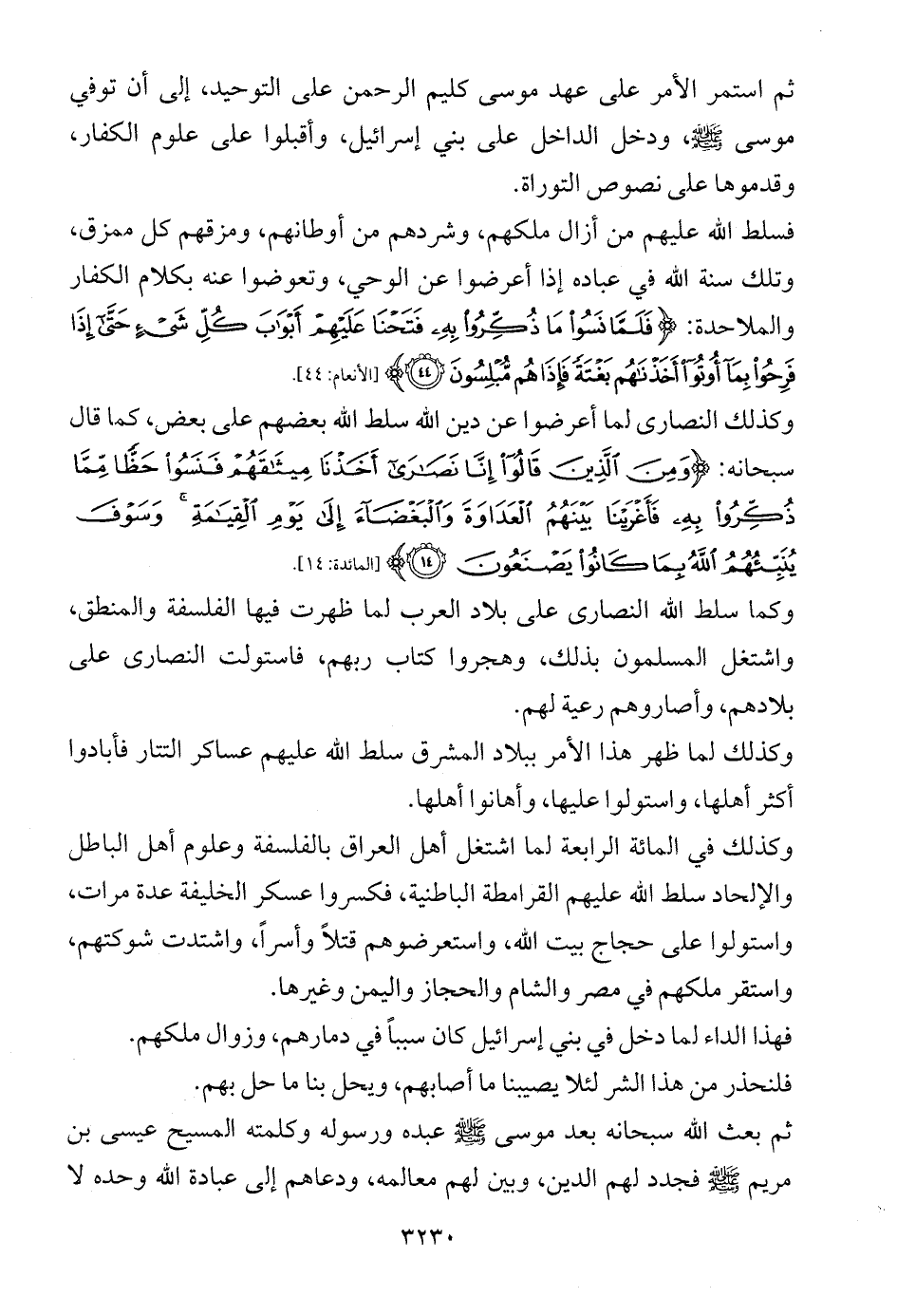 وكما سلط الله النصارى على بلاد العرب لما ظهرت فيها الفلسفة والمنطق، واشتغل المسلمون بذلك، وهجروا كتاب ربهم، فاستولت النصارى على بلادهم، وأصاروهم رعية لهم.