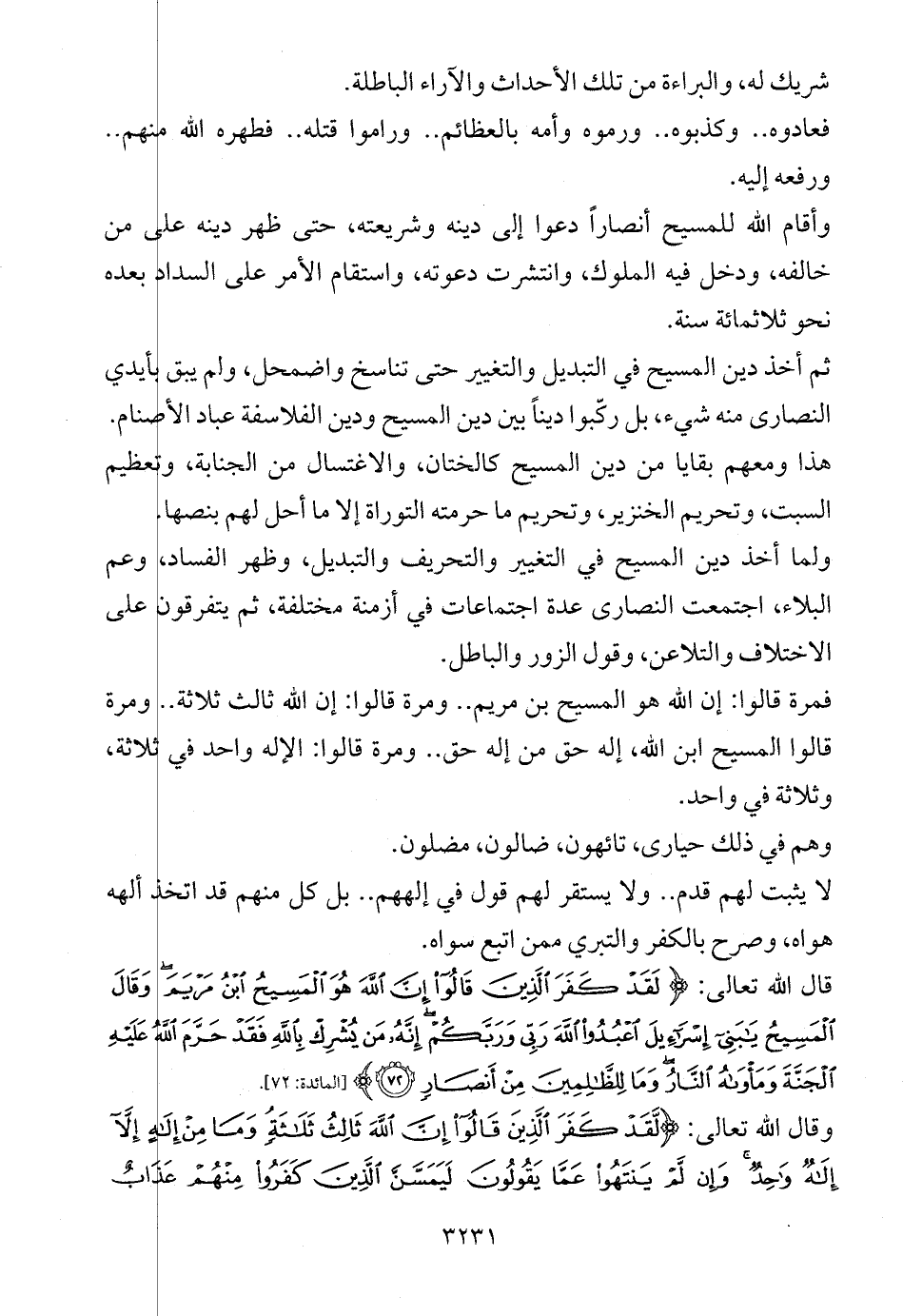 قال الله تعالى: {لَقَدْ كَفَرَ الَّذِينَ قَالُوا إِنَّ اللَّهَ هُوَ الْمَسِيحُ ابْنُ مَرْيَمَ وَقَالَ الْمَسِيحُ يَابَنِي إِسْرَائِيلَ اعْبُدُوا اللَّهَ رَبِّي وَرَبَّكُمْ إِنَّهُ مَنْ يُشْرِكْ بِاللَّهِ فَقَدْ حَرَّمَ اللَّهُ عَلَيْهِ الْجَنَّةَ وَمَأْوَاهُ النَّارُ وَمَا لِلظَّالِمِينَ مِنْ أَنْصَارٍ (72)} [المائدة: 72].