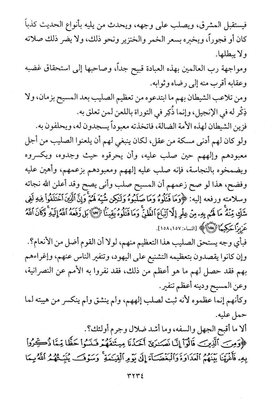 ولو كان لهم أدنى مسكة من عقل، لكان ينبغي لهم أن يلعنوا الصليب من أجل معبودهم وإلههم حين صلب عليه، وأن يحرقوه حيث وجدوه، ويكسروه ويضمخوه بالنجاسة، فإنه صلب عليه إلههم ومعبودهم بزعمهم، وأهين عليه وفضح، هذا لو صح زعمهم أن المسيح صلب وأنى يصح وقد أعلن الله نجاته وسلامته ورفعه إليه: {وَمَا قَتَلُوهُ وَمَا صَلَبُوهُ وَلَكِنْ شُبِّهَ لَهُمْ وَإِنَّ الَّذِينَ اخْتَلَفُوا فِيهِ لَفِي شَكٍّ مِنْهُ مَا لَهُمْ بِهِ مِنْ عِلْمٍ إِلَّا اتِّبَاعَ الظَّنِّ وَمَا قَتَلُوهُ يَقِينًا (157) بَلْ رَفَعَهُ اللَّهُ إِلَيْهِ وَكَانَ اللَّهُ عَزِيزًا حَكِيمًا (158)} [النساء: 157، 158].